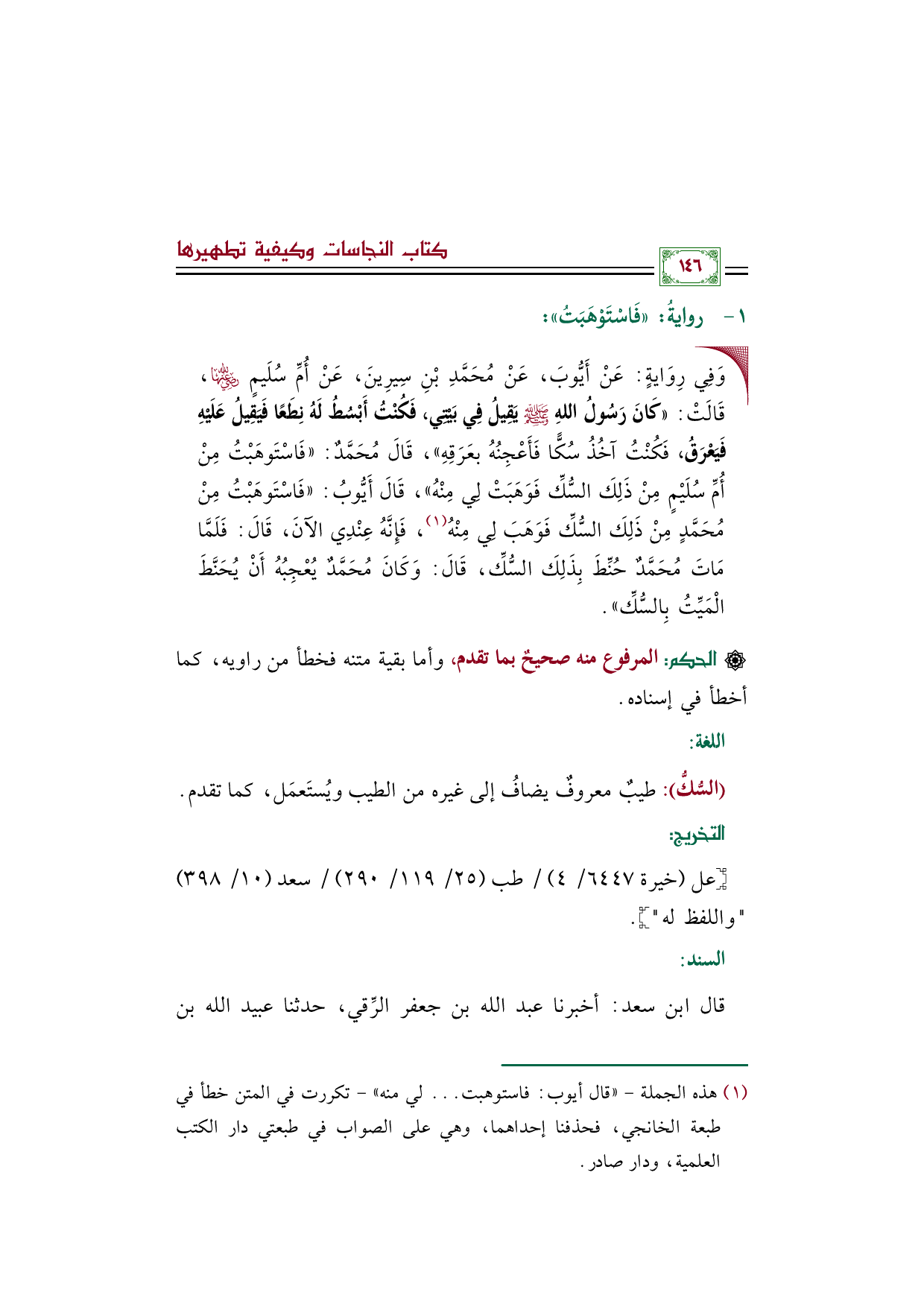 • وَفِي رِوَايةٍ: عَنْ أَيُّوبَ، عَنْ مُحَمَّدِ بْنِ سِيرِينَ، عَنْ أُمِّ سُلَيمٍ رضي الله عنها، قَالَتْ: ((كَانَ رَسُولُ اللهِ صلى الله عليه وسلم يَقِيلُ فِي بَيْتِي، فَكُنْتُ أَبْسُطُ لَهُ نِطَعًا فَيَقِيلُ عَلَيْهِ فَيَعْرَقُ، فَكُنْتُ آخُذُ سُكًّا فَأَعْجِنُهُ بعَرَقِهِ))، قَالَ مُحَمَّدٌ: ((فَاسْتَوهَبْتُ مِنْ أُمِّ سُلَيْمٍ مِنْ ذَلِكَ السُّكِّ فَوَهَبَتْ لِي مِنْهُ))، قَالَ أَيُّوبُ: ((فَاسْتَوهَبْتُ مِنْ مُحَمَّدٍ مِنْ ذَلِكَ السُّكِّ فَوَهَبَ لِي مِنْهُ (¬١)، فَإِنَّهُ عِنْدِي الآَنَ، قَالَ: فَلَمَّا مَاتَ مُحَمَّدٌ حُنِّطَ بِذَلِكَ السُّكِّ، قَالَ: وَكَانَ مُحَمَّدٌ يُعْجِبُهُ أَنْ يُحَنَّطَ الْمَيِّتُ بِالسُّكِّ)).