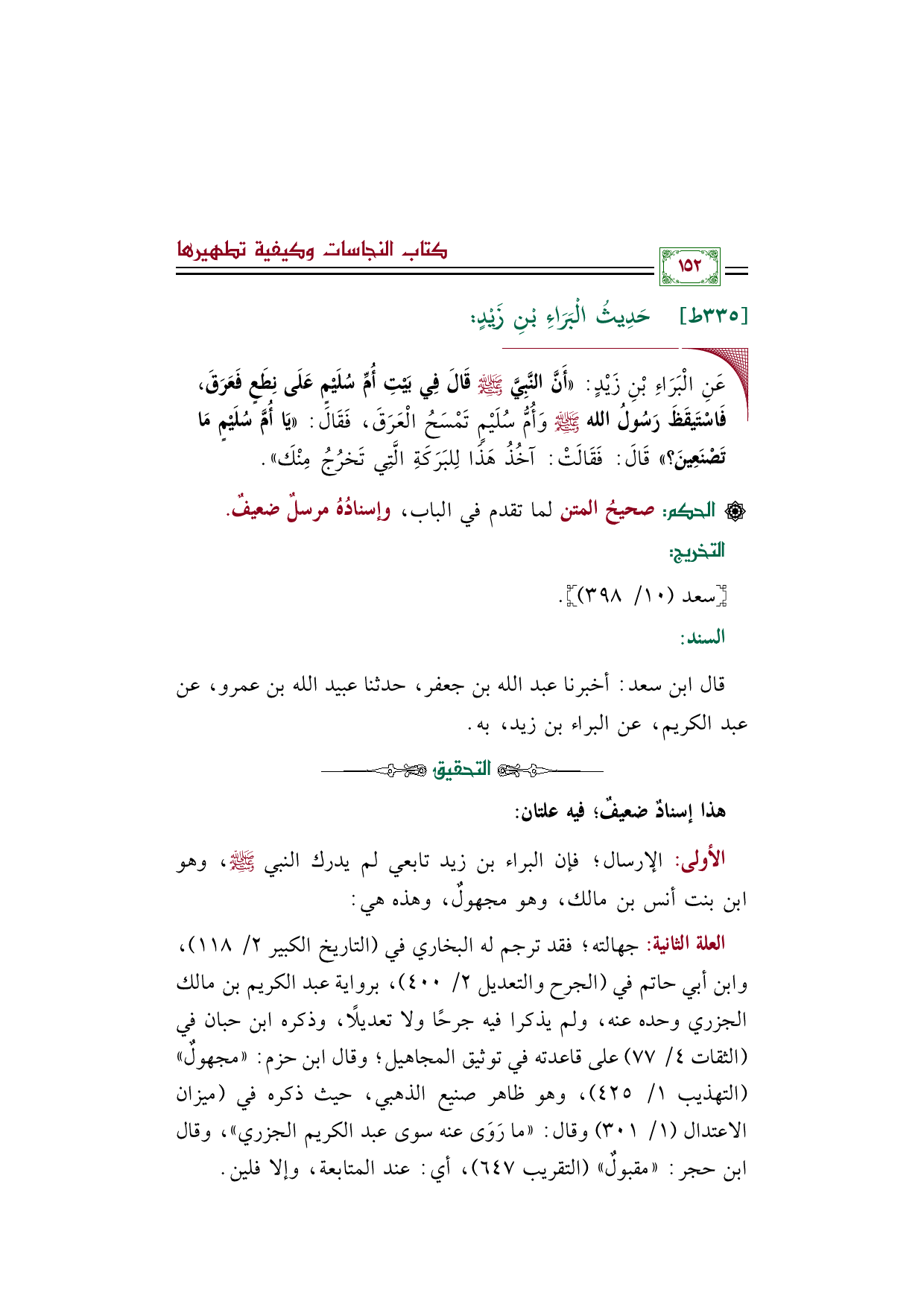 الأولى: الإرسال؛ فإن البراء بن زيد تابعي لم يدرك النبي صلى الله عليه وسلم، وهو ابن بنت أنس بن مالك، وهو مجهولٌ، وهذه هي: