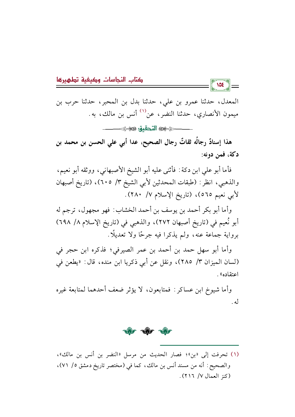 (¬١) تحرفت إلى ((بن))؛ فصار الحديث من مرسل ((النضر بن أنس بن مالك))، والصحيح: أنه من مسند أنس بن مالك، كما في (مختصر تاريخ دمشق ٥/ ٧١)، (كنز العمال ٧/ ٢١٦).