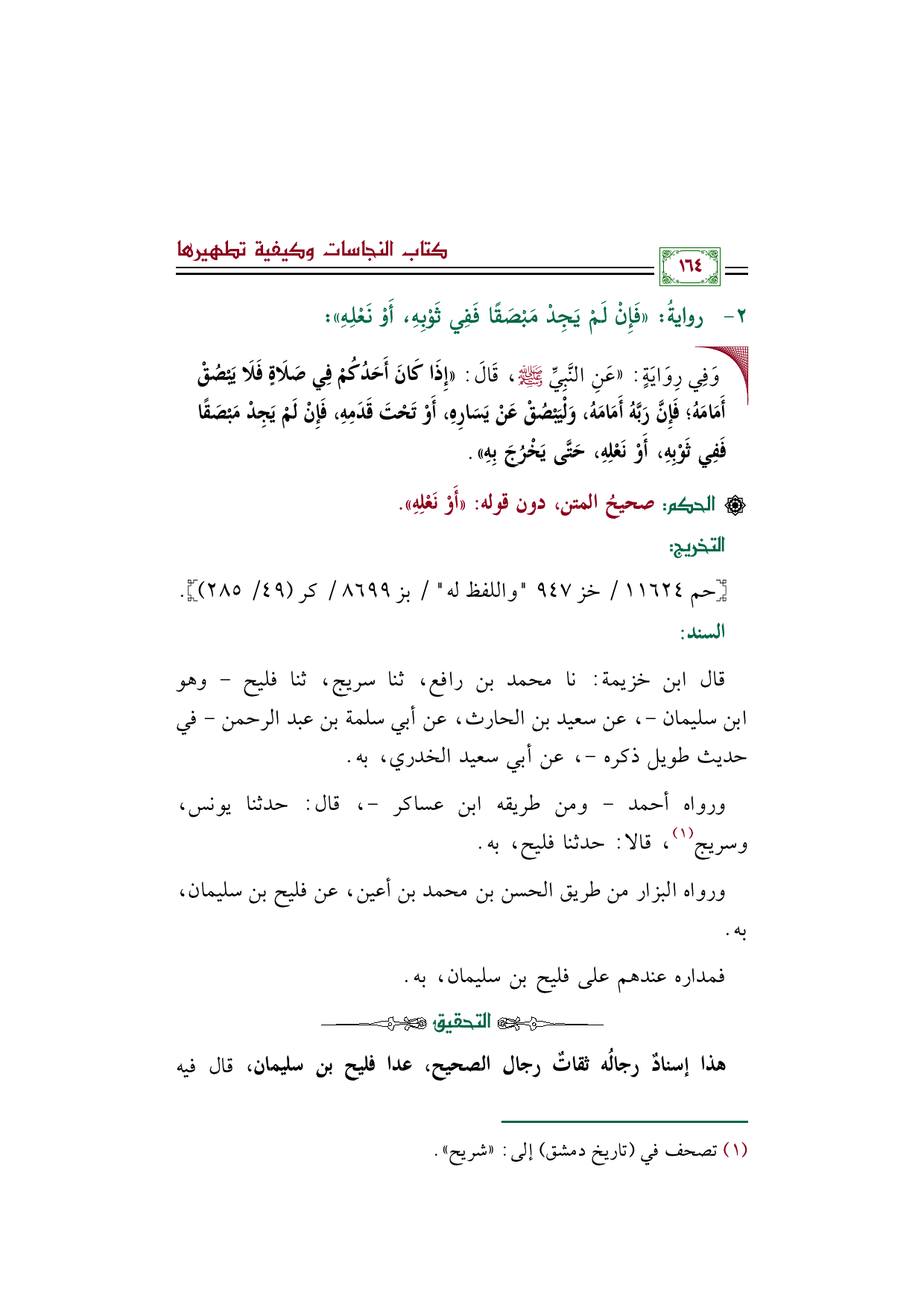 قال ابن خزيمة: نا محمد بن رافع، ثنا سريج، ثنا فليح -وهو ابن سليمان-، عن سعيد بن الحارث، عن أبي سلمة بن عبد الرحمن-في حديث طويل ذكره-، عن أبي سعيد الخدري، به.