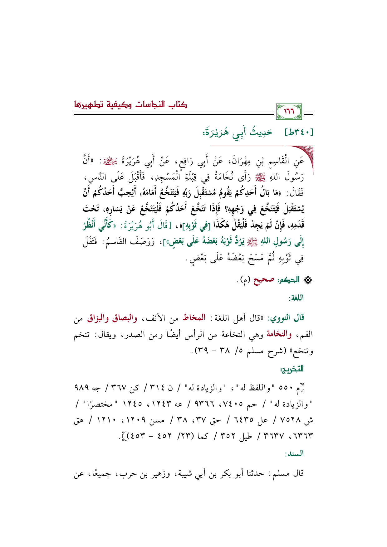 ◼ عَنِ الْقَاسِمِ بْنِ مِهْرَانَ، عَنْ أَبِي رَافِعٍ، عَنْ أَبِي هُرَيْرَةَ رضي الله عنه: ((أَنَّ رَسُولَ اللهِ صلى الله عليه وسلم رَأَى نُخَامَةً فِي قِبْلَةِ الْمَسْجِدِ، فَأَقْبَلَ عَلَى النَّاسِ، فَقَالَ: ((مَا بَالُ أَحَدِكُمْ يَقُومُ مُسْتَقْبِلَ رَبِّهِ فَيَتَنَخَّعُ أَمَامَهُ، أَيُحِبُّ أَحَدُكُمْ أَنْ يُسْتَقْبَلَ فَيُتَنَخَّعَ فِي وَجْهِهِ؟ فَإِذَا تَنَخَّعَ أَحَدُكُمْ فَلْيَتَنَخَّعْ عَنْ يَسَارِهِ، تَحْتَ قَدَمِهِ، فَإِنْ لَمْ يَجِدْ فَلْيَقُلْ هَكَذَا [فِي ثَوْبِهِ]))، [قَالَ أَبُو هُرَيْرَةَ: ((كَأَنِّي أَنْظُرُ إِلَى رَسُولِ اللهِ صلى الله عليه وسلم يَرُدُّ ثَوْبَهُ بَعْضَهُ عَلَى بَعْضٍ))]، وَوَصَفَ القَاسمُ: فَتَفَلَ فِي ثَوْبِهِ ثُمَّ مَسَحَ بَعْضَهُ عَلَى بَعْضٍ.