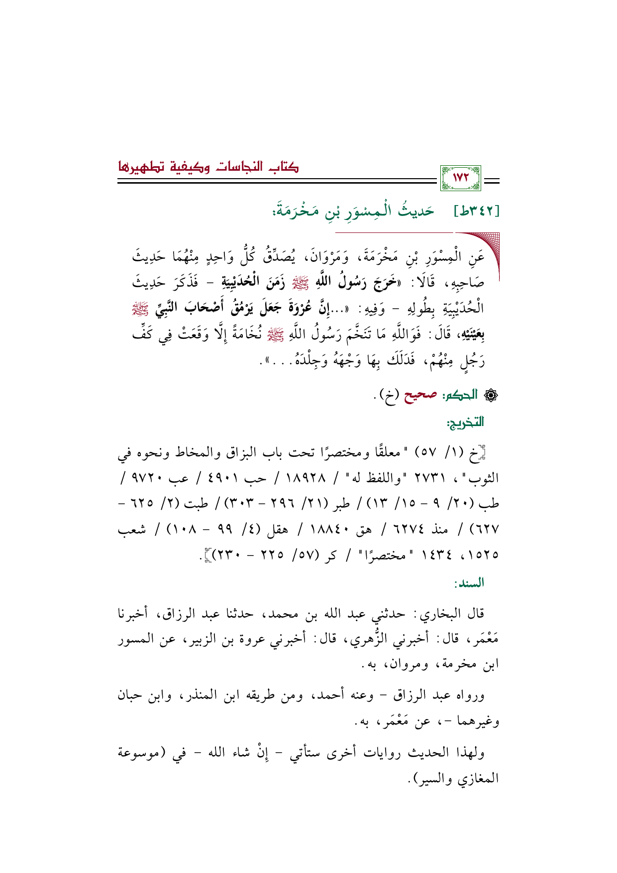 قال البخاري: حدثني عبد الله بن محمد، حدثنا عبد الرزاق، أخبرنا مَعْمَر، قال: أخبرني الزُّهري، قال: أخبرني عروة بن الزبير، عن المسور بن مخرمة، ومروان، به.