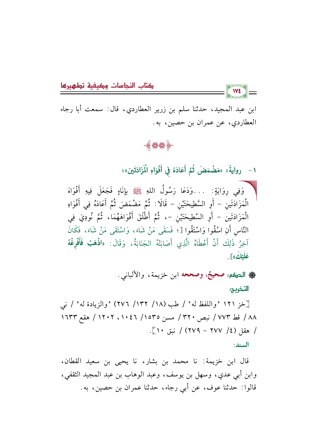 روايةُ (مَضْمَضَ ثُمَّ أَعَادَهُ فِي أَفْوَاهِ الْمَزَادَتَين):