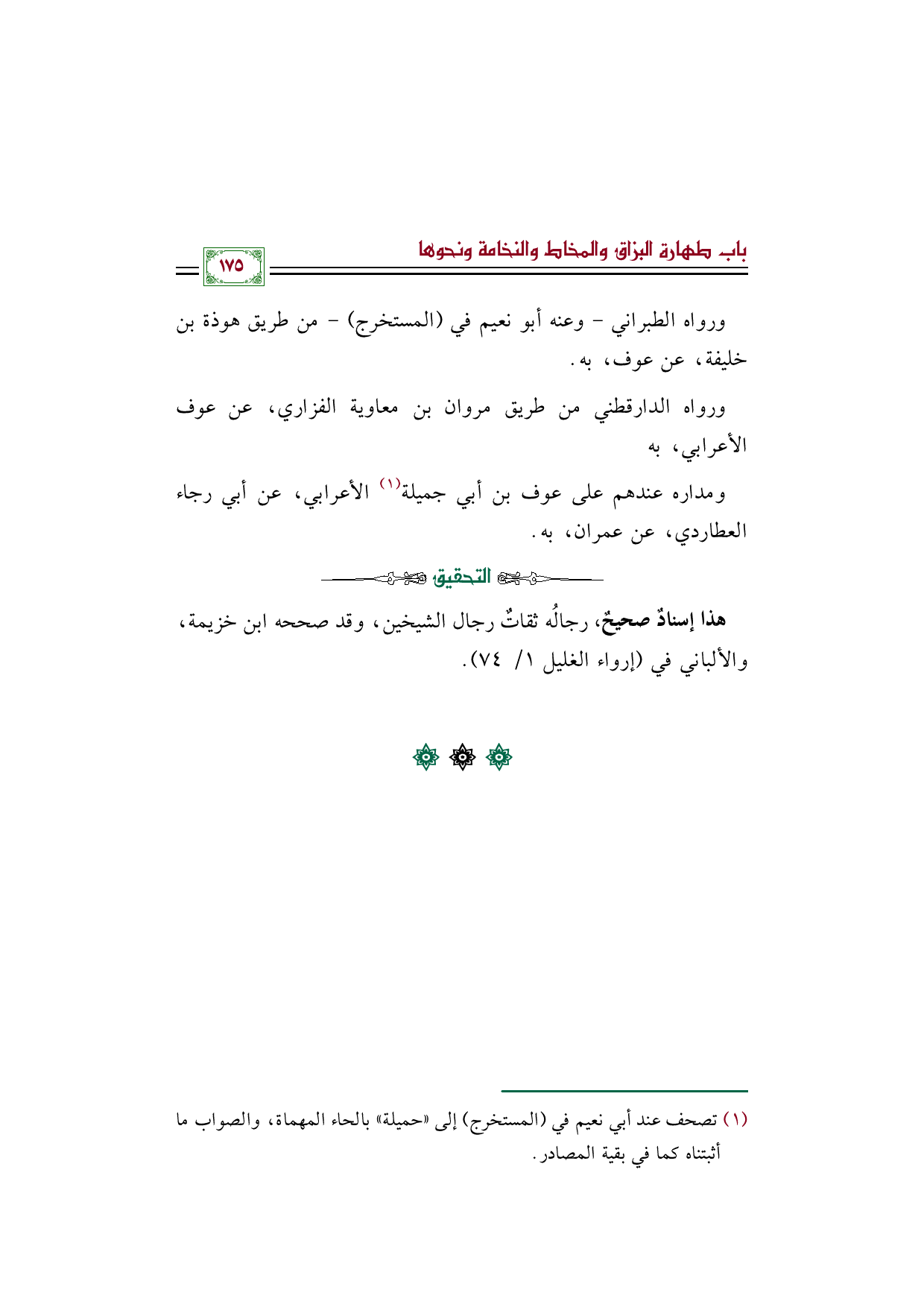 ورواه الطبراني -وعنه أبو نعيم في (المستخرج) - من طريق هوذة بن خليفة، عن عوف، به.