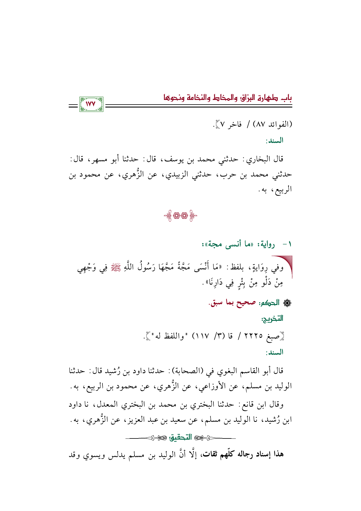 قال (البخاري): حدثني محمد بن يوسف، قال: حدثنا أبو مسهر، قال: حدثني محمد بن حرب، حدثني الزبيدي، عن الزُّهري، عن محمود بن الربيع، به.