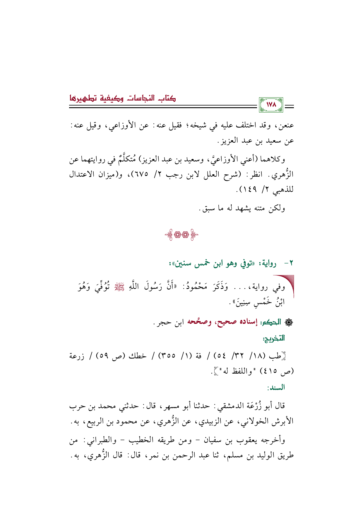 قال (أبو زُرْعَة الدمشقي): حدثنا أبو مسهر، قال: حدثني محمد بن حرب الأبرش الخولاني، عن الزبيدي، عن الزُّهري، عن محمود بن الربيع، به.