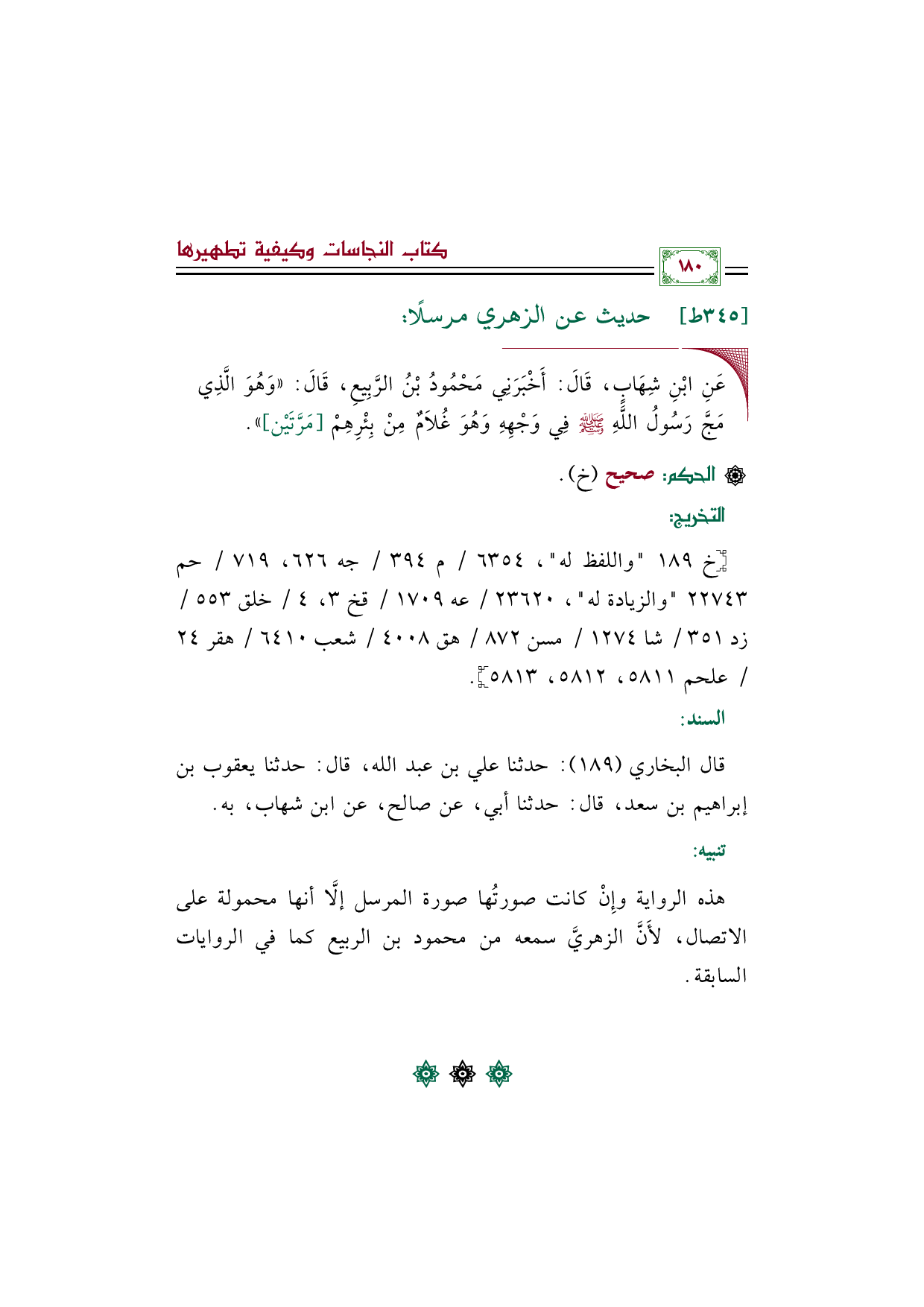 ◼ عَنِ ابْنِ شِهَابٍ، قَالَ: أَخْبَرَنِي مَحْمُودُ بْنُ الرَّبِيعِ، قَالَ: ((وَهُوَ الَّذِي مَجَّ رَسُولُ اللَّهِ صلى الله عليه وسلم فِي وَجْهِهِ وَهُوَ غُلامٌ مِنْ بِئْرِهِمْ [مَرَّتَيْن])).