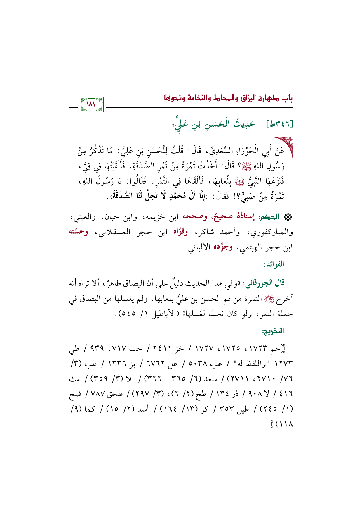 ◼ عَنْ أَبِي الْحَوْرَاءِ السَّعْدِيِّ، قَالَ: قُلْتُ لِلْحَسَنِ بْنِ عَلِيٍّ: مَا تَذْكُرُ مِنْ رَسُولِ اللهِ صلى الله عليه وسلم؟ قَالَ: أَخَذْتُ تَمْرَةً مِنْ تَمْرِ الصَّدَقَةِ، فَأَلْقَيْتُهَا فِي فِيَّ، فَنَزَعَهَا النَّبِيُّ صلى الله عليه وسلم بِلُعَابِهَا، فَأَلْقَاهَا فِي التَّمْرِ، فَقَالُوا: يَا رَسُولَ اللهِ، تَمْرَةٌ مِنْ صَبِيٍّ؟ ! فَقَالَ: ((إِنَّا آلَ مُحَمَّدٍ لَا تَحِلُّ لَنَا الصَّدَقَةُ)).