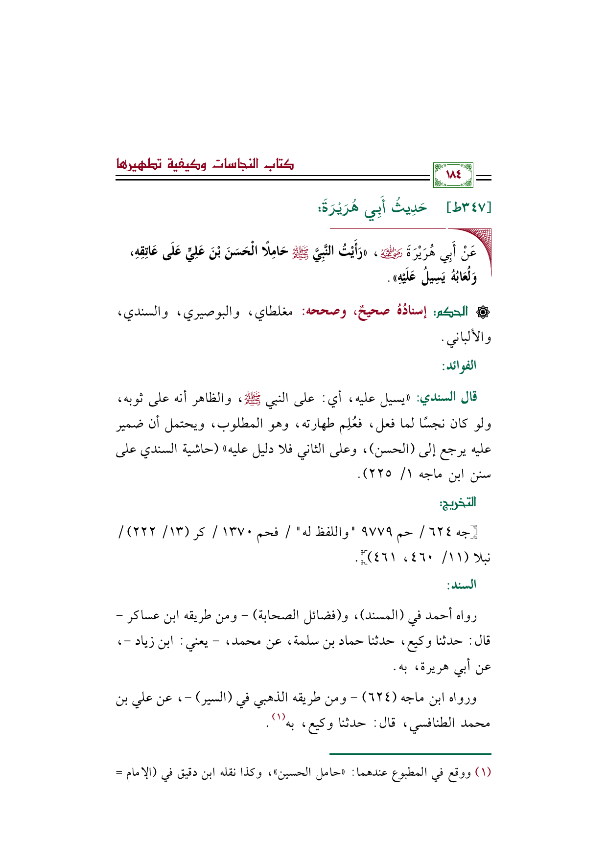 قال السندي: ((يسيل عليه، أي: على النبي صلى الله عليه وسلم، والظاهر أنه على ثوبه، ولو كان نجسًا لما فعل، فعُلِم طهارته، وهو المطلوب، ويحتمل أن ضمير عليه يرجع إلى (الحسن)، وعلى الثاني فلا دليل عليه)) (حاشية السندي على سنن ابن ماجه ١/ ٢٢٥).