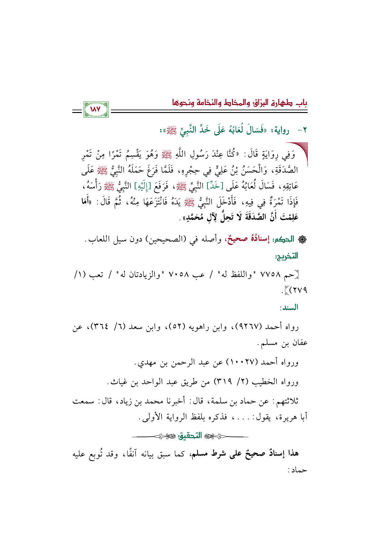 • وَفِي رِوَايَةٍ قَالَ: ((كُنَّا عِنْدَ رَسُولِ اللَّهِ صلى الله عليه وسلم وَهُوَ يَقْسِمُ تَمْرًا مِنْ تَمْرِ الصَّدَقَةِ، وَالْحَسَنُ بْنُ عَلِيٍّ فِي حِجْرِهِ، فَلَمَّا فَرَغَ حَمَلَهُ النَّبِيُّ صلى الله عليه وسلم عَلَى عَاتِقِهِ، فَسَالَ لُعَابُهُ عَلَى [خَدِّ] النَّبِيِّ صلى الله عليه وسلم، فَرَفَعَ [إِلَيْهِ] النَّبِيُّ صلى الله عليه وسلم رَأْسَهُ، فَإِذَا تَمْرَةٌ فِي فِيهِ، فَأَدْخَلَ النَّبِيُّ صلى الله عليه وسلم يَدَهُ فَانْتَزَعَهَا مِنْهُ، ثُمَّ قَالَ: ((أَمَا عَلِمْتَ أَنَّ الصَّدَقَةَ لَا تَحِلُّ لِآلِ مُحَمَّدٍ)).