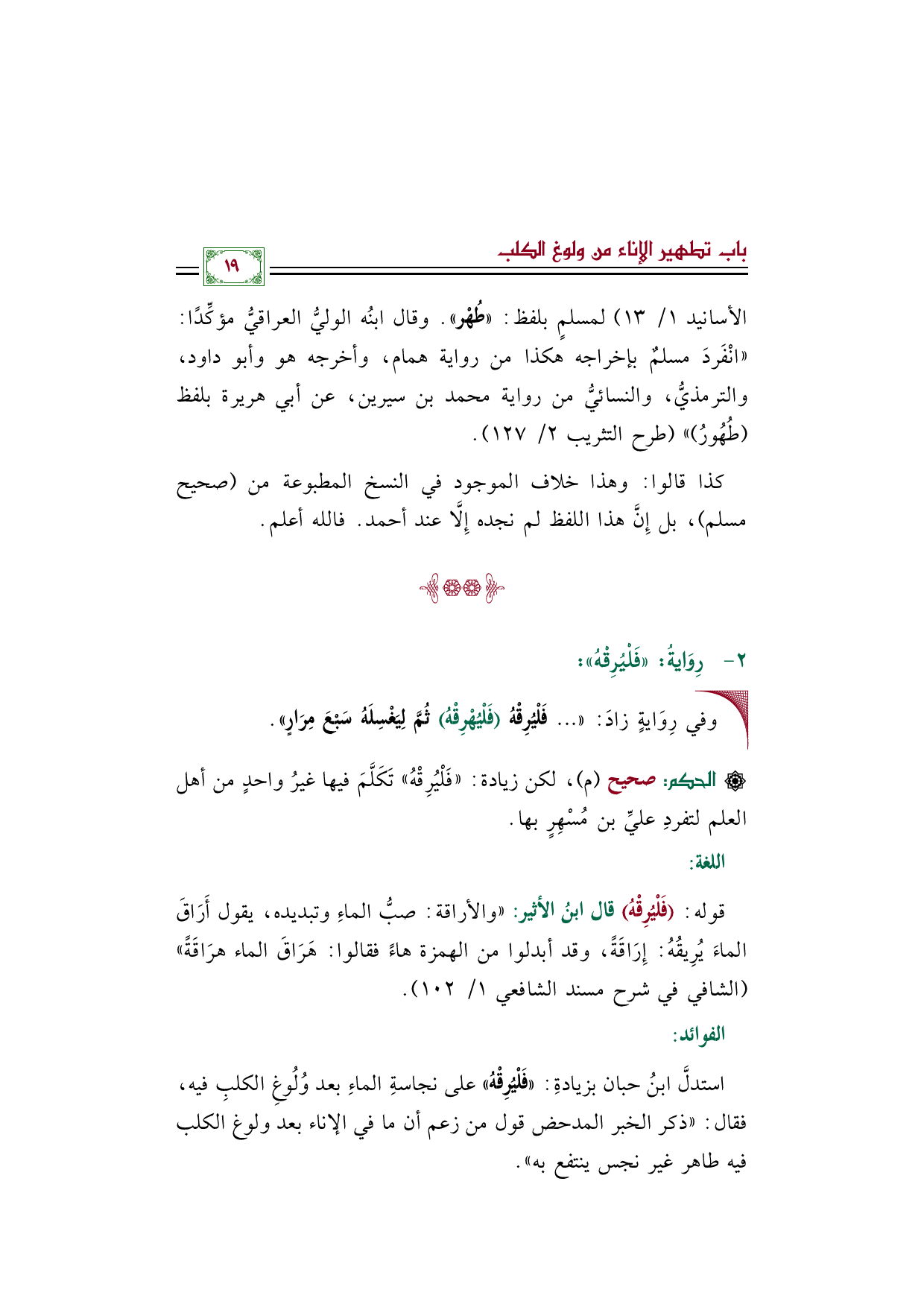 الأسانيد ١/ ١٣) لمسلمٍ بلفظ: ((طُهْر)). وقال ابنُه الوليُّ العراقيُّ مؤكِّدًا: ((انْفَردَ مسلمٌ بإخراجه هكذا من رواية همام، وأخرجه هو وأبو داود، والترمذيُّ، والنسائيُّ من رواية محمد بن سيرين، عن أبي هريرة بلفظ (طُهُورُ))) (طرح التثريب ٢/ ١٢٧).