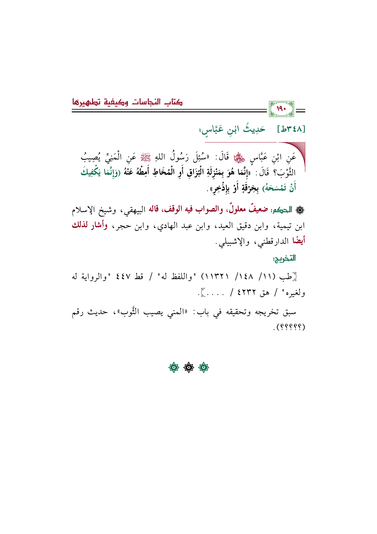 ◼ عَنِ ابْنِ عَبَّاسٍ رضي الله عنهما قَالَ: ((سُئِلَ رَسُولُ اللهِ صلى الله عليه وسلم عَنِ الْمَنِيِّ يُصِيبُ الثَّوْبَ؟ قَالَ: ((إِنَّمَا هُوَ بِمَنْزِلَةِ الْبُزَاقِ أَوِ الْمُخَاطِ أَمِطْهُ عَنْهُ (وَإِنَّمَا يَكْفِيكَ أَنْ تَمْسَحَهُ) بِخِرْقَةٍ أَوْ بِإِذْخِرٍ)).