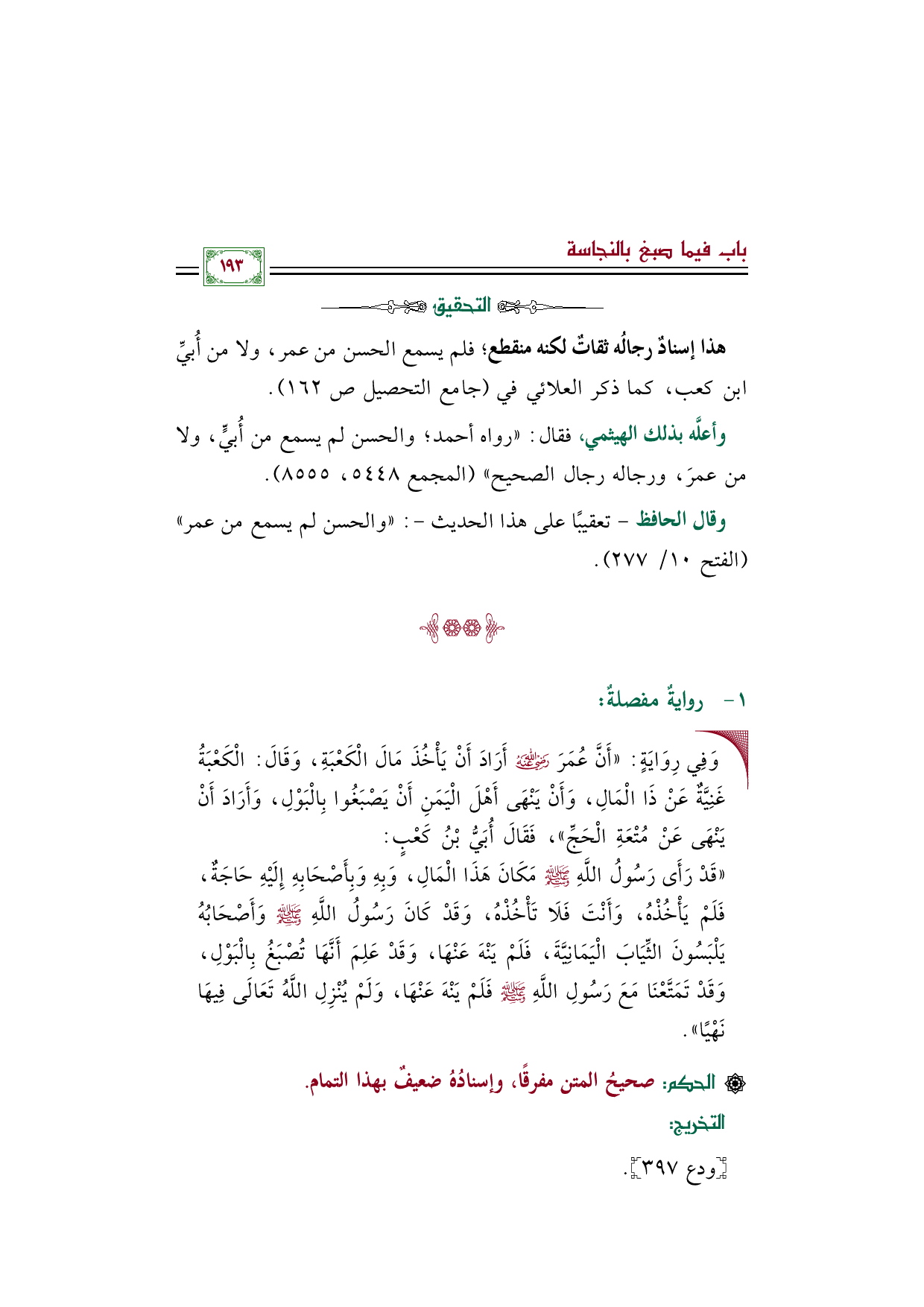 وأعلَّه بذلك الهيثمي، فقال: ((رواه أحمد؛ والحسن لم يسمع من أُبيٍّ، ولا من عمرَ، ورجاله رجال الصحيح)) (المجمع ٥٤٤٨، ٨٥٥٥).
