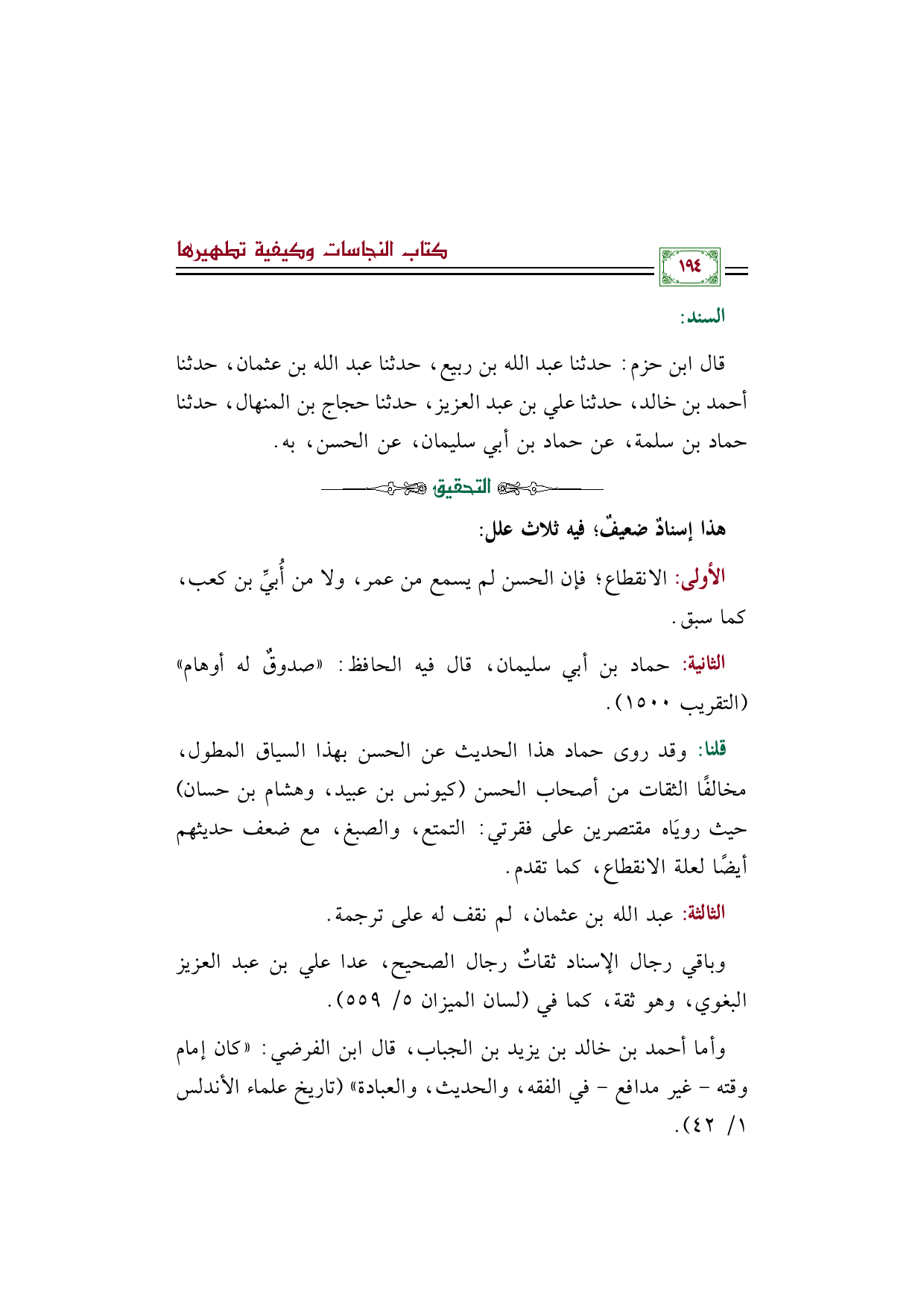 قال ابن حزم: حدثنا عبد الله بن ربيع، حدثنا عبد الله بن عثمان، حدثنا أحمد بن خالد، حدثنا علي بن عبد العزيز، حدثنا حجاج بن المنهال، حدثنا حماد بن سلمة، عن حماد بن أبي سليمان، عن الحسن، به.
