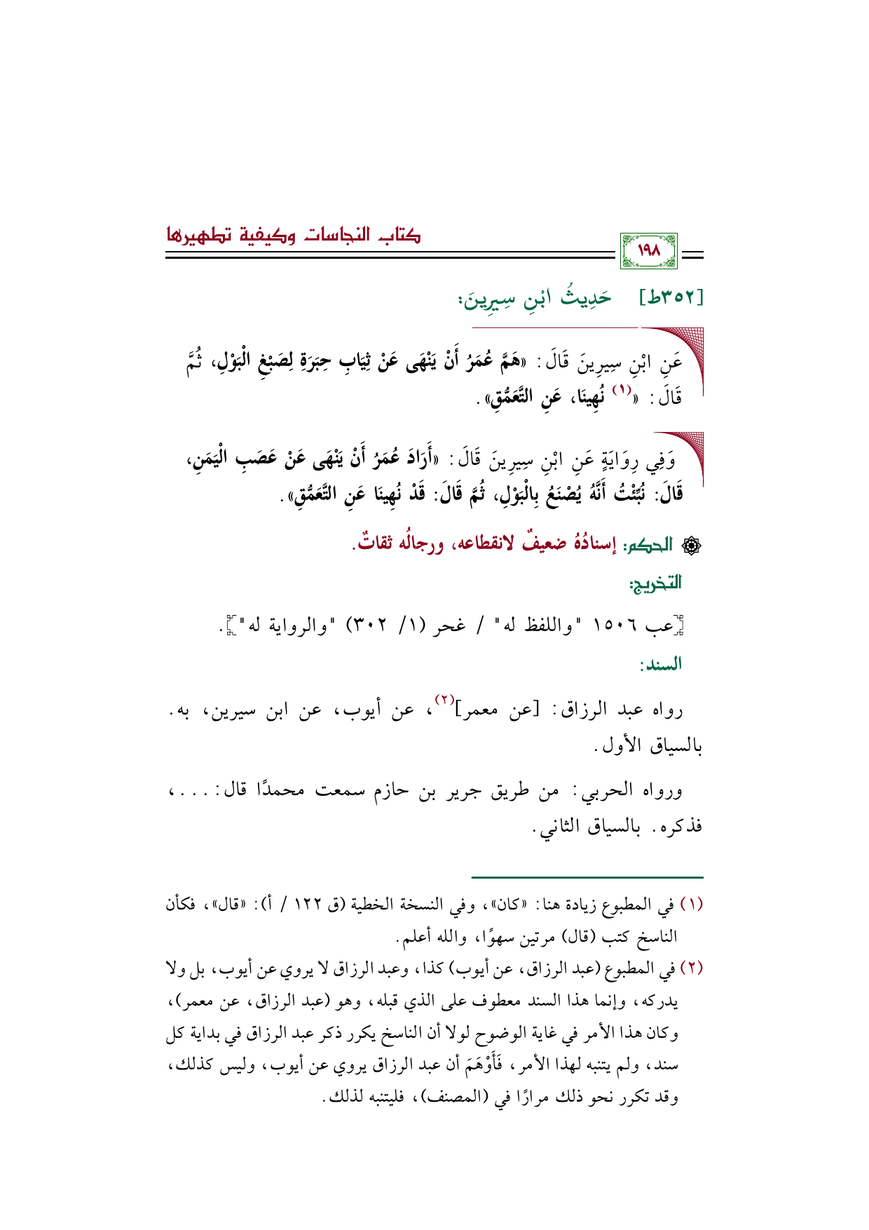 (¬٢) في المطبوع (عبد الرزاق، عن أيوب) كذا، وعبد الرزاق لا يروي عن أيوب، بل ولا يدركه، وإنما هذا السند معطوف على الذي قبله، وهو (عبد الرزاق، عن معمر)، وكان هذا الأمر في غاية الوضوح لولا أن الناسخ يكرر ذكر عبد الرزاق في بداية كل سند، ولم يتنبه لهذا الأمر، فَأَوْهَمَ أن عبد الرزاق يروي عن أيوب، وليس كذلك، وقد تكرر نحو ذلك مرارًا في (المصنف)، فليتنبه لذلك.