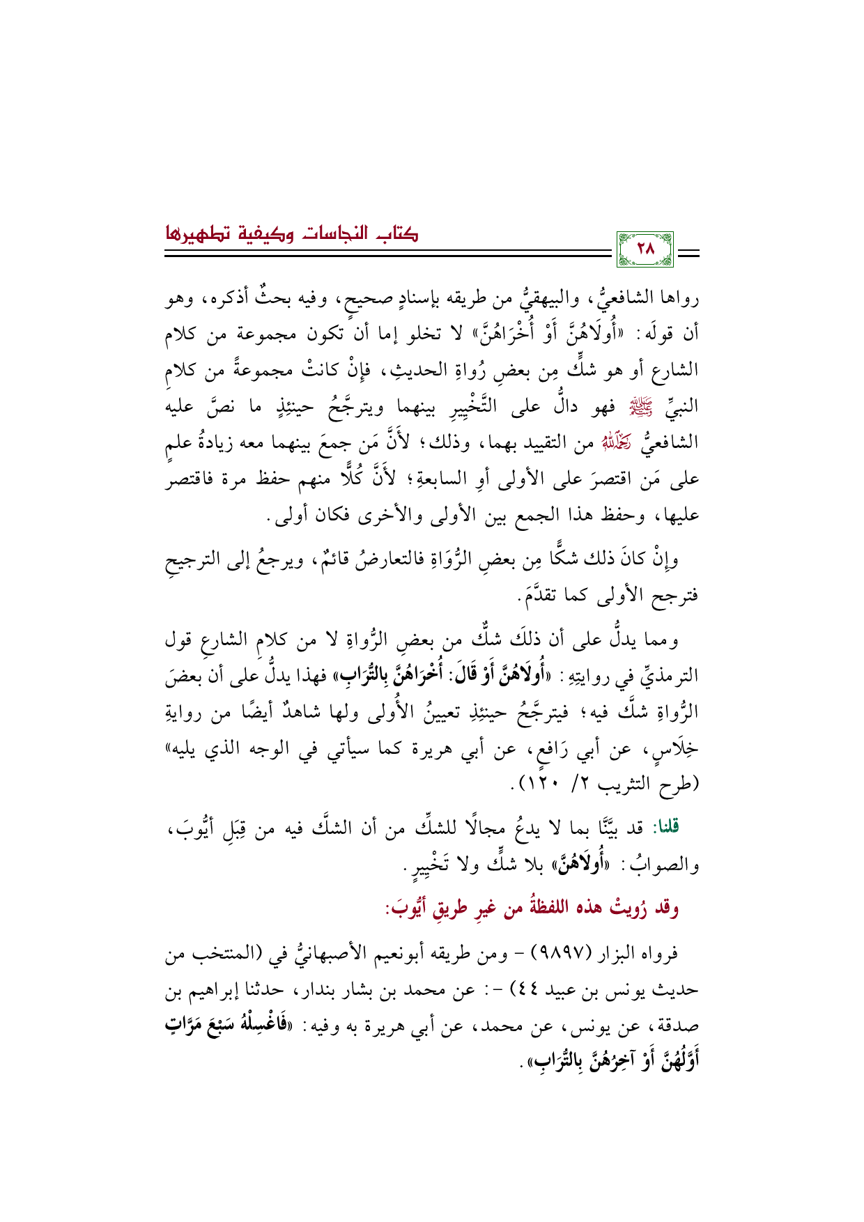 ومما يدلُّ على أن ذلكَ شكٌّ من بعضِ الرُّواةِ لا من كلامِ الشارعِ قول الترمذيِّ في روايتِهِ: ((أُولَاهُنَّ أَوْ قَالَ: أُخْرَاهُنَّ بِالتُّرَابِ)) فهذا يدلُّ على أن بعضَ الرُّواةِ شكَّ فيه؛ فيترجَّحُ حينئِذِ تعيينُ الأُولى ولها شاهدٌ أيضًا من روايةِ خِلَاسٍ، عن أبي رَافعٍ، عن أبي هريرة كما سيأتي في الوجه الذي يليه)) (طرح التثريب ٢/ ١٢٠).
