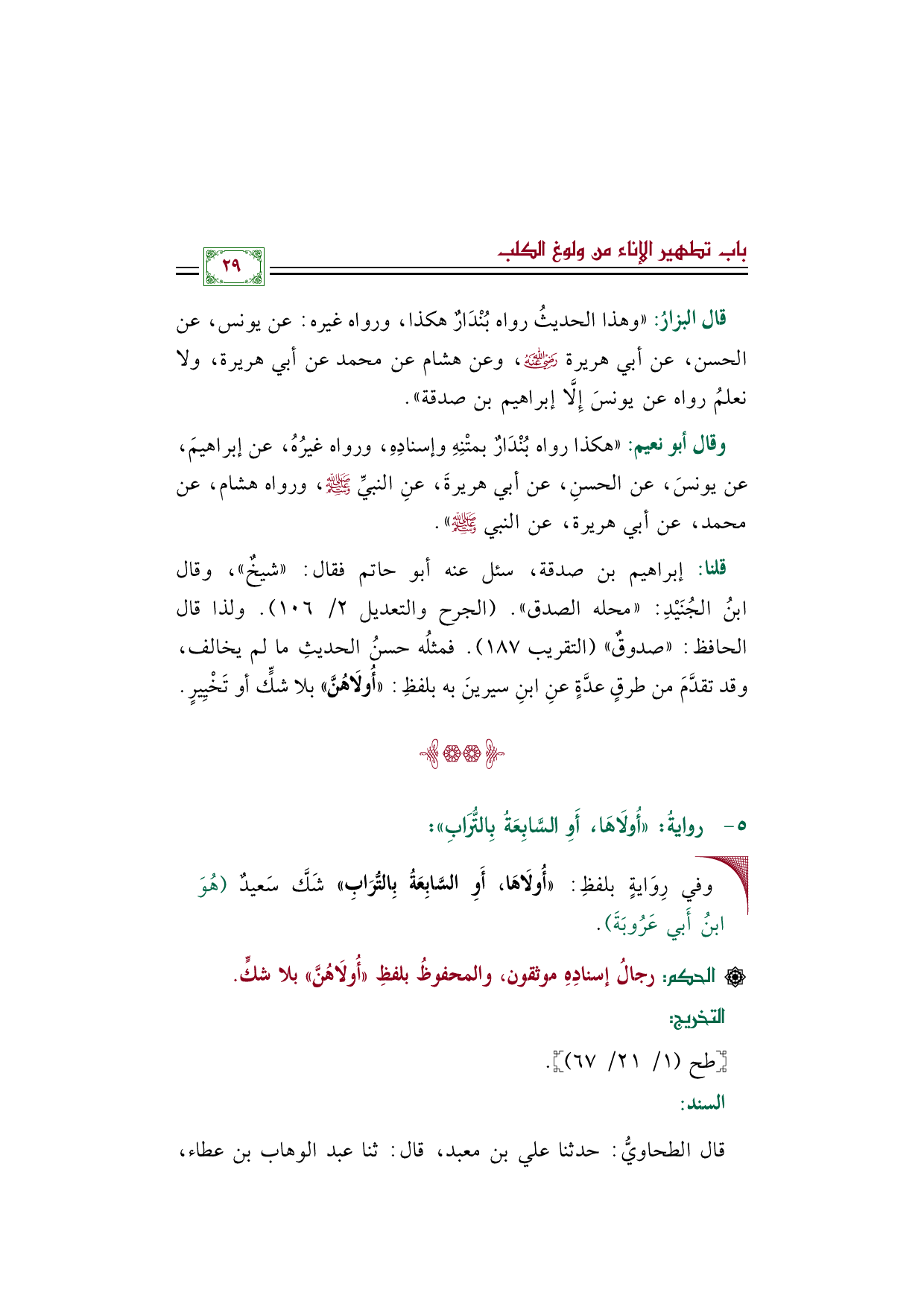 قلنا: إبراهيم بن صدقة، سئل عنه أبو حاتم فقال: ((شيخٌ))، وقال ابنُ الجُنَيْدِ: ((محله الصدق)). (الجرح والتعديل ٢/ ١٠٦). ولذا قال الحافظ: ((صدوقٌ)) (التقريب ١٨٧). فمثلُه حسنُ الحديثِ ما لم يخالف، وقد تقدَّمَ من طرقٍ عدَّةٍ عنِ ابنِ سيرينَ به بلفظِ: ((أُولَاهُنَّ)) بلا شكٍّ أو تَخْيِيرٍ.
