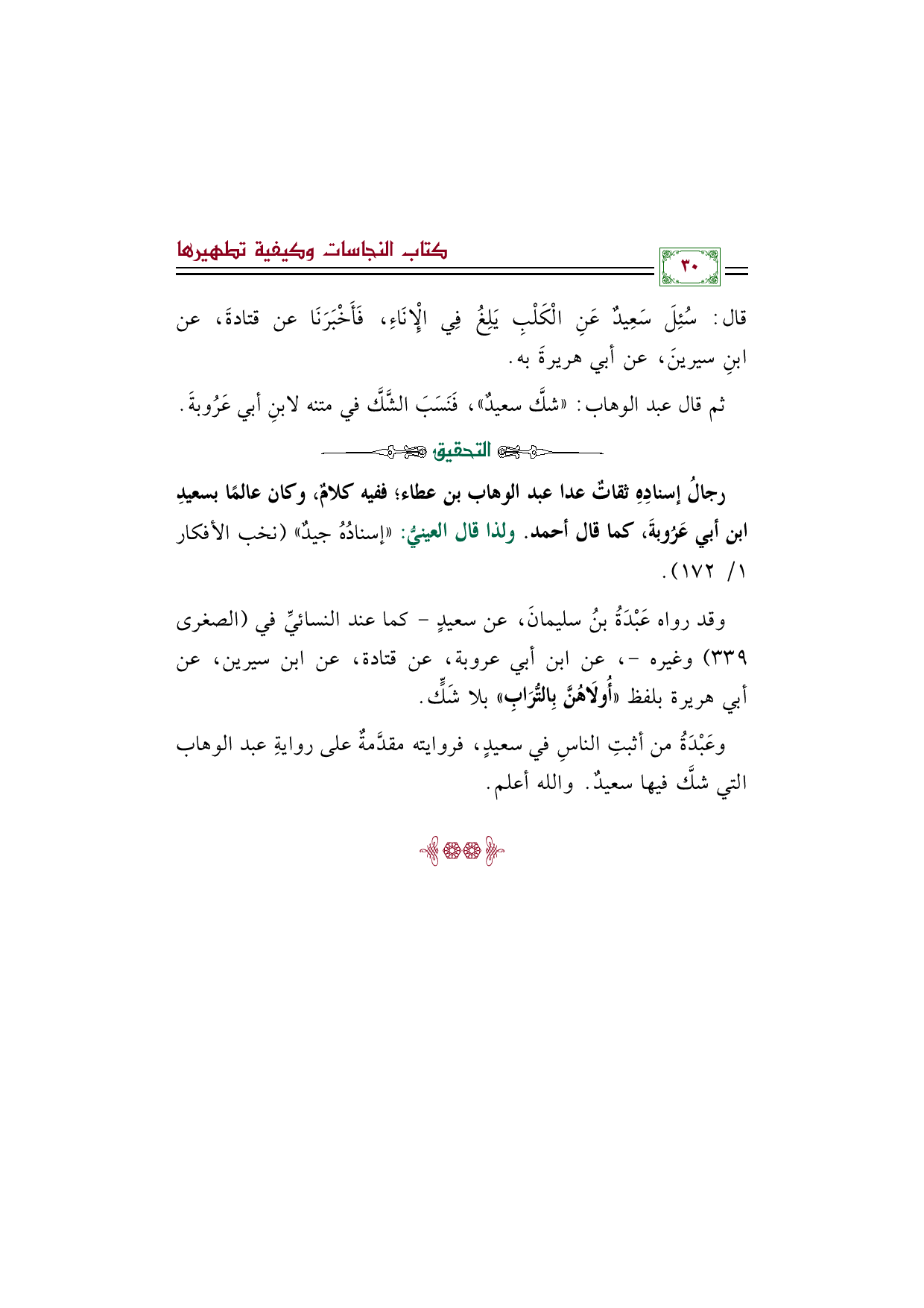 وقد رواه عَبْدَةُ بنُ سليمانَ، عن سعيدٍ - كما عند النسائيِّ في (الصغرى ٣٣٩) وغيره -، عن ابن أبي عروبة، عن قتادة، عن ابن سيرين، عن أبي هريرة بلفظ ((أُولَاهُنَّ بِالتُّرَابِ)) بلا شَكٍّ.