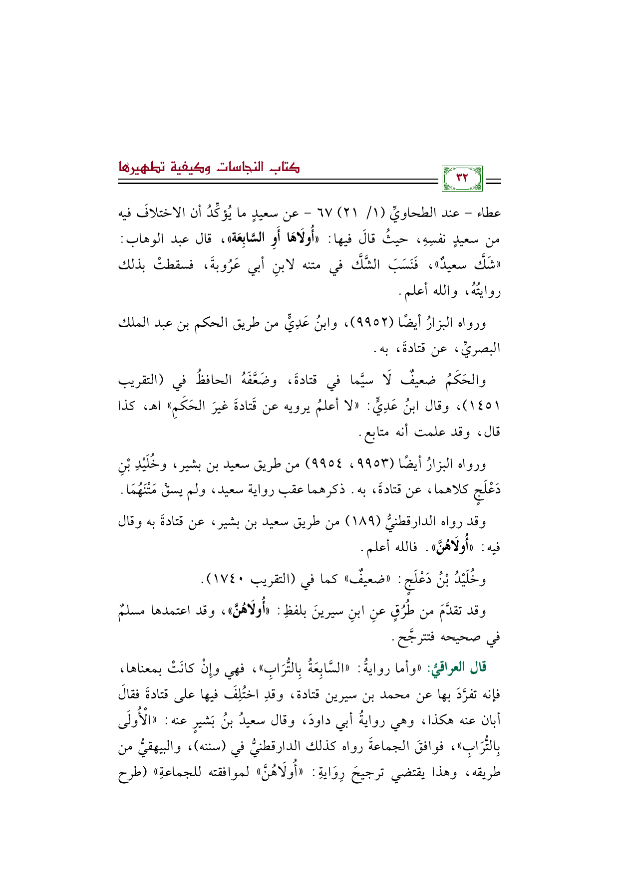 قال العراقيُّ: ((وأما روايةُ: ((السَّابِعَةُ بِالتُّرَابِ))، فهي وإِنْ كانَتْ بمعناها، فإنه تفرَّدَ بها عن محمد بن سيرين قتادة، وقدِ اختُلِفَ فيها على قتادةَ فقالَ أبان عنه هكذا، وهي روايةُ أبي داودَ، وقال سعيدُ بنُ بَشيرٍ عنه: ((الْأُولَى بِالتُّرَابِ))، فوافقَ الجماعةَ رواه كذلك الدارقطنيُّ في (سننه)، والبيهقيُّ من طريقه، وهذا يقتضي ترجيحَ رِوَايةِ: ((أُولَاهُنَّ)) لموافقته للجماعةِ)) (طرح