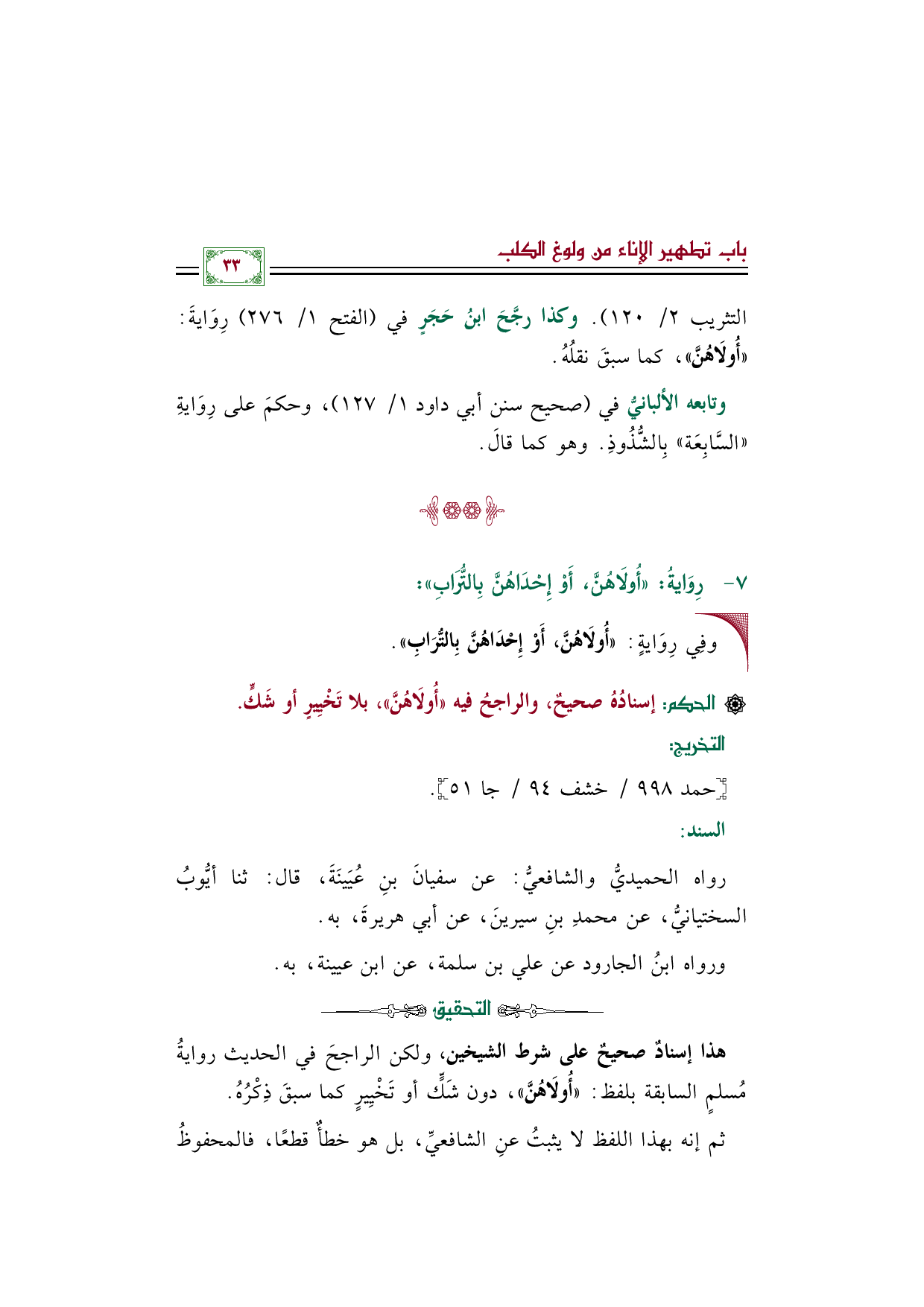 وتابعه الألبانيُّ في (صحيح سنن أبي داود ١/ ١٢٧)، وحكمَ على رِوَايةِ ((السَّابِعَة)) بِالشُّذُوذِ. وهو كما قالَ.