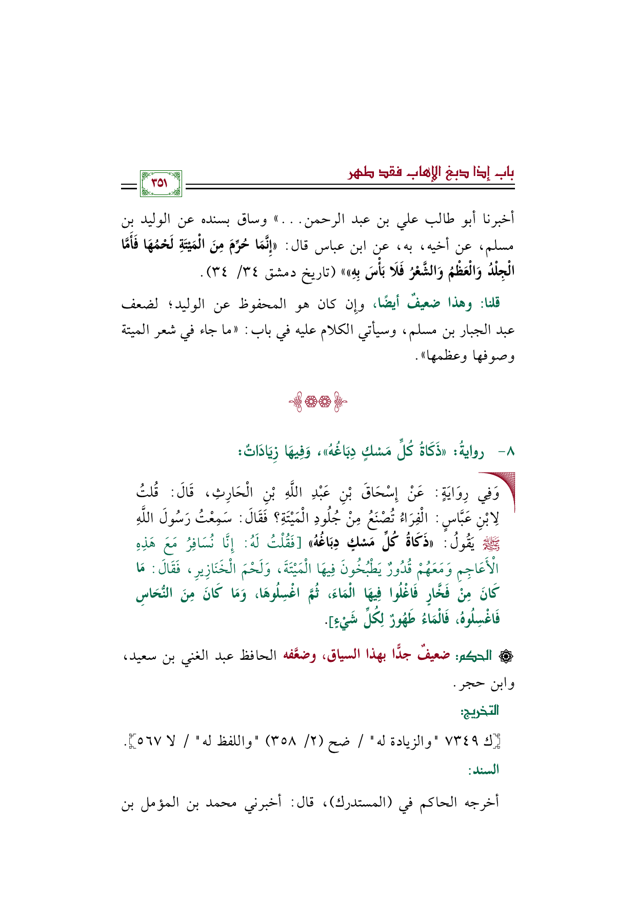قلنا: وهذا ضعيفٌ أيضًا، وإِن كان هو المحفوظ عن الوليد؛ لضعف عبد الجبار بن مسلم، وسيأتي الكلام عليه في باب: ((ما جاء في شعر الميتة وصوفها وعظمها)).