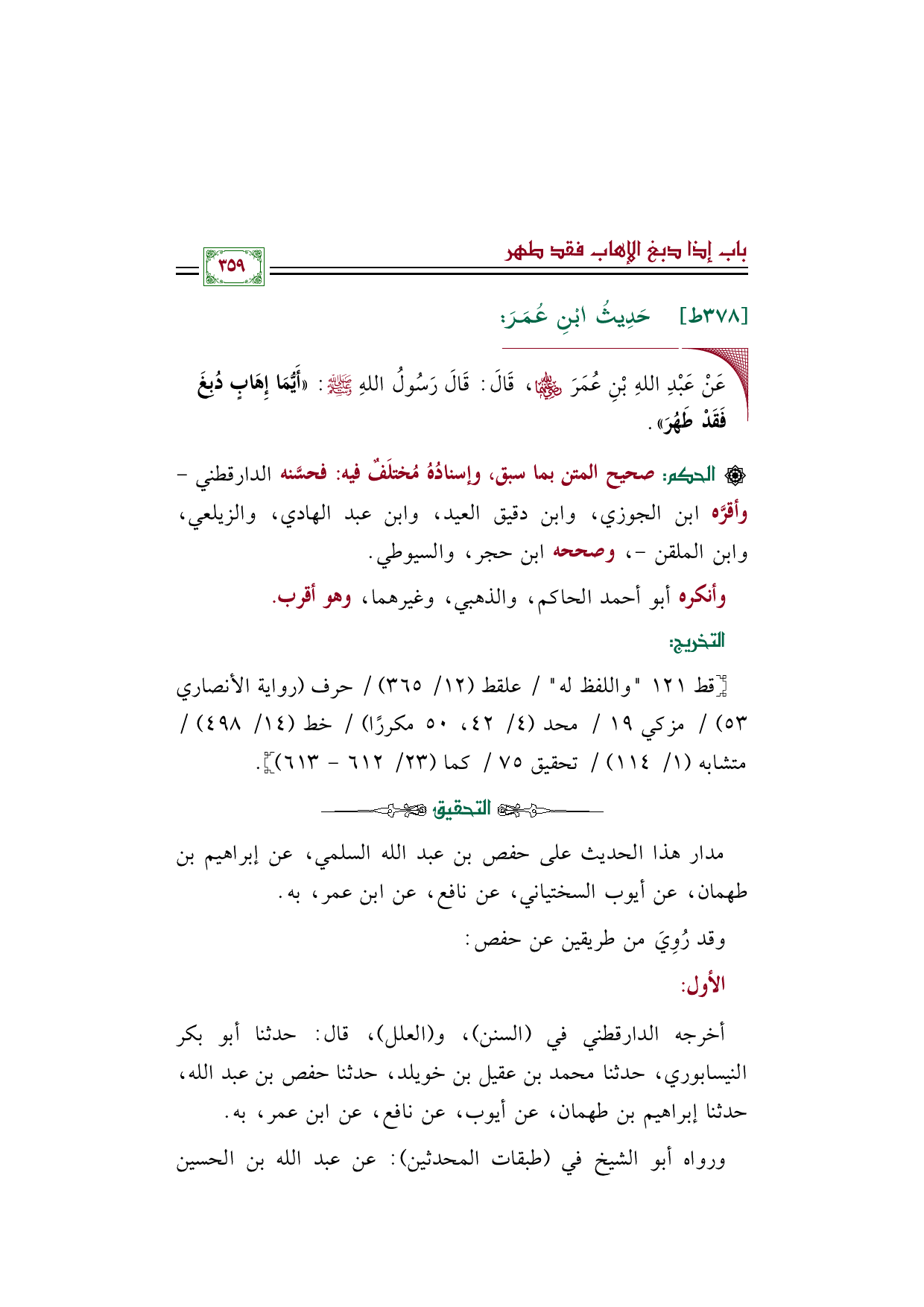 ◼ عَنْ عَبْدِ اللهِ بْنِ عُمَرَ رضي الله عنهما، قَالَ: قَالَ رَسُولُ اللهِ صلى الله عليه وسلم: ((أَيُّمَا إِهَابٍ دُبِغَ فَقَدْ طَهُرَ)).