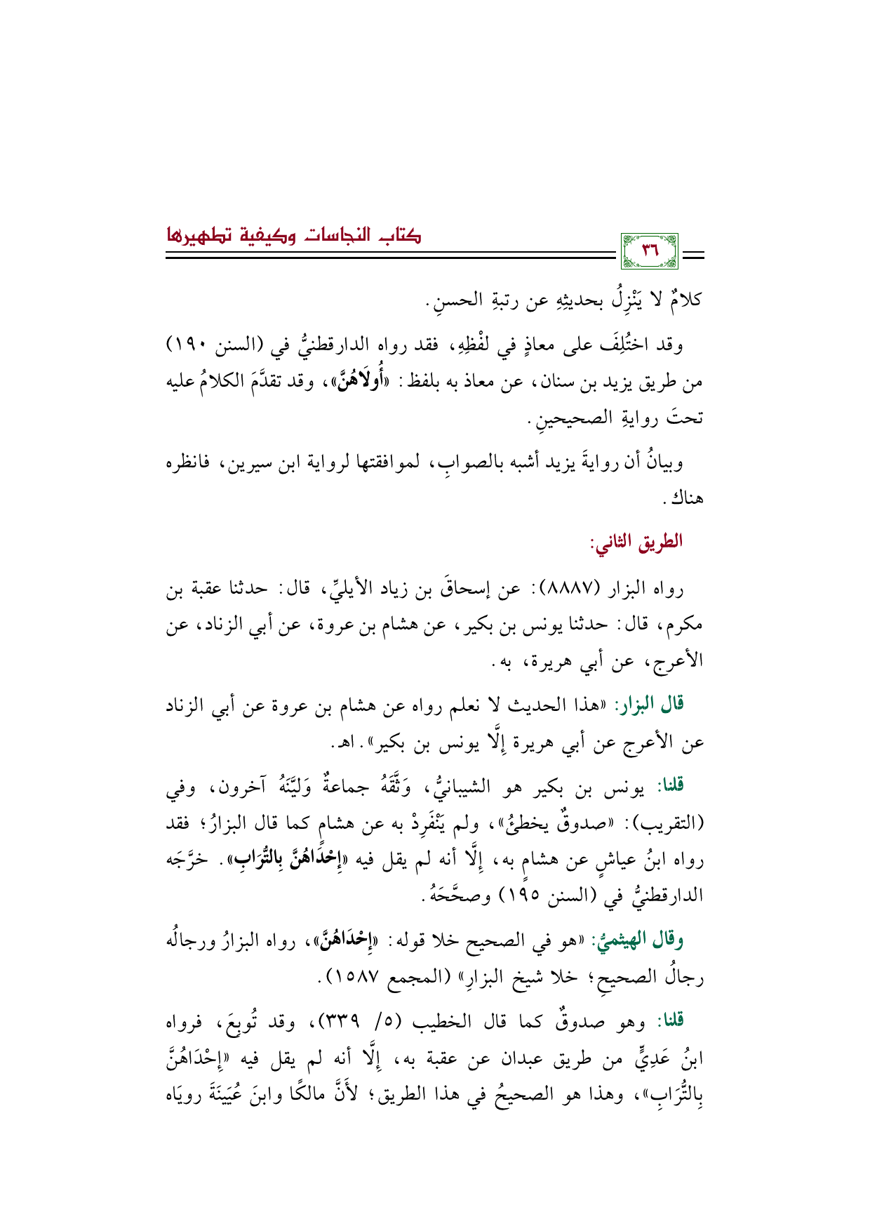 قلنا: يونس بن بكير هو الشيبانيُّ، وَثَّقَهُ جماعةٌ وَليَّنَهُ آخرون، وفي التقريب: ((صدوقٌ يخطئُ))، ولم يَنْفَرِدْ به عن هشامٍ كما قال البزارُ؛ فقد رواه ابنُ عياشٍ عن هشامٍ به، إِلَّا أنه لم يقل فيه ((إِحْدَاهُنَّ بِالتُّرَابِ)). خرَّجَه الدارقطنيُّ في (السنن ١٩٥) وصحَّحَهُ.
