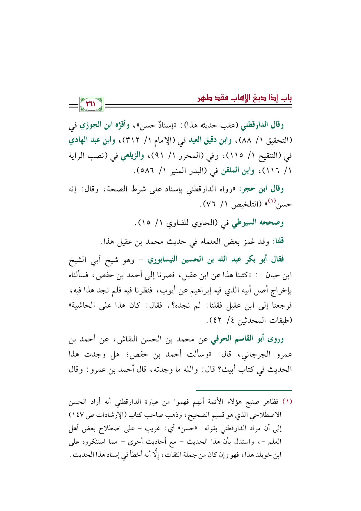 وقال الدارقطني (عقب حديثه هذا): ((إسنادٌ حسن))، وأقرَّه ابن الجوزي في (التحقيق ١/ ٨٨)، وابن دقيق العيد في (الإمام ١/ ٣١٢)، وابن عبد الهادي في (التنقيح ١/ ١١٥)، وفي (المحرر ١/ ٩١)، والزيلعي في (نصب الراية ١/ ١١٦)، وابن الملقن في (البدر المنير ١/ ٥٨٦).