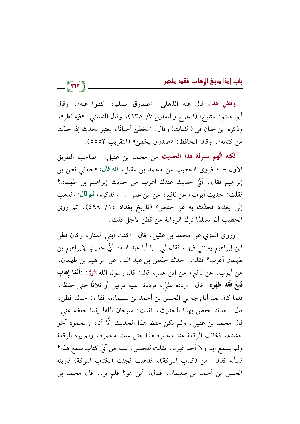 لكنه اتُّهم بسرقة هذا الحديث من محمد بن عقيل -صاحب الطريق الأول-؛ فروى الخطيب عن محمد بن عقيل، أنه قال: ((جاءني قطن بن إبراهيم فقال: أيُّ حديثٍ عندك أغرب من حديث إبراهيم بن طهمان؟ فقلت: حديث أيوب، عن نافع، عن ابن عمر ... )) فذكره، ثم قال: ((فذهب إلى بغداد فحدَّث به عن حفص)) (تاريخ بغداد ١٤/ ٤٩٨)، ثم روى الخطيب أن مسلمًا ترك الرواية عن قطن لأجل ذلك.