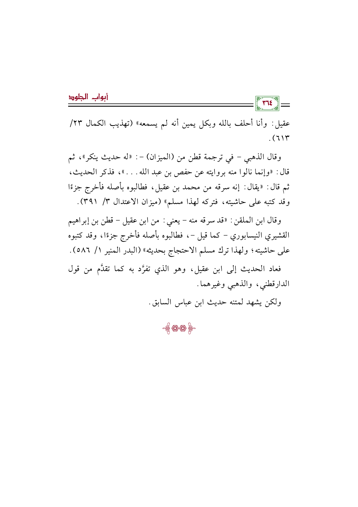وقال ابن الملقن: ((قد سرقه منه -يعني: من ابن عقيل- قطن بن إبراهيم القشيري النيسابوري -كما قيل-، فطالبوه بأصله فأخرج جزءًا، وقد كتبوه على حاشيته؛ ولهذا ترك مسلم الاحتجاج بحديثه)) (البدر المنير ١/ ٥٨٦).