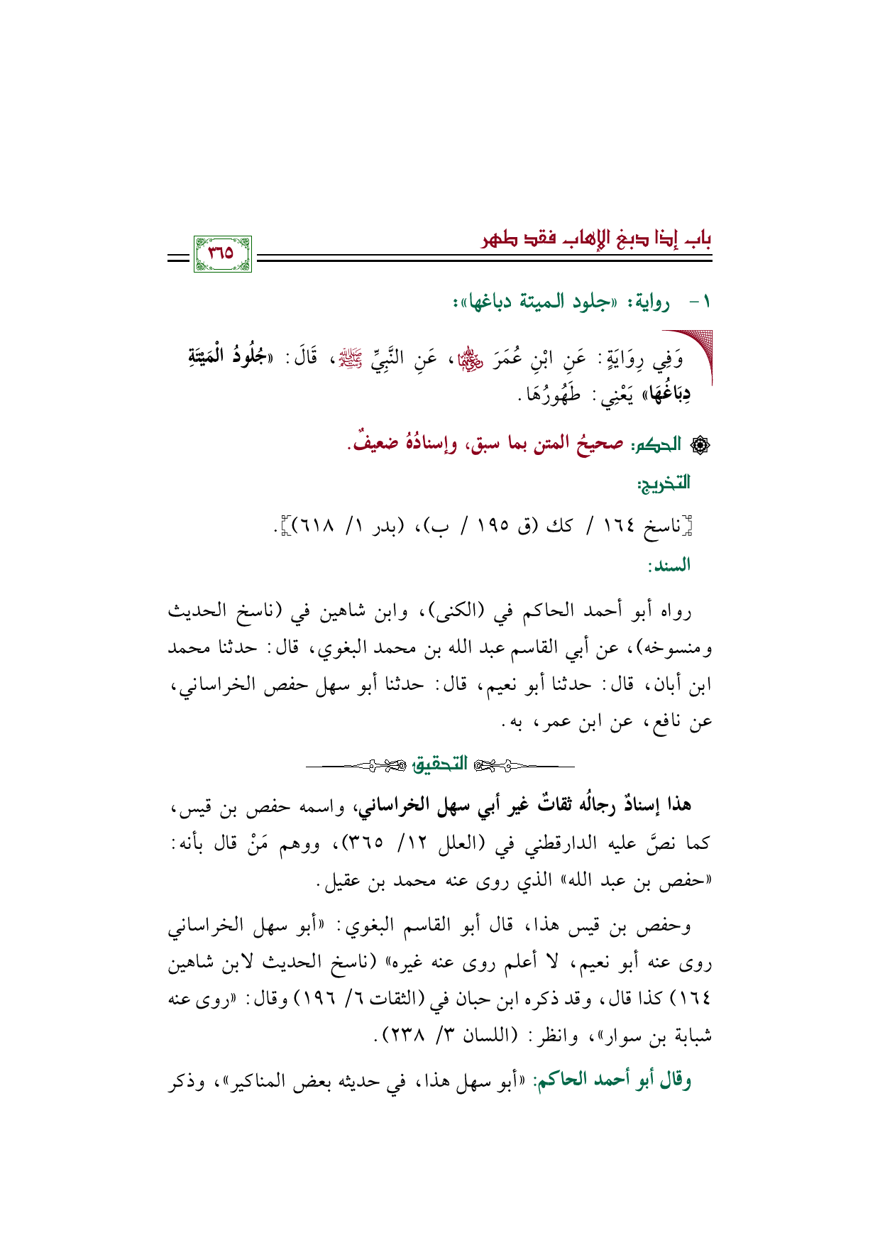 رواه أبو أحمد الحاكم في (الكنى)، وابن شاهين في ((ناسخ الحديث ومنسوخه))، عن أبي القاسم عبد الله بن محمد البغوي، قال: حدثنا محمد بن أبان، قال: حدثنا أبو نعيم، قال: حدثنا أبو سهل حفص الخراساني، عن نافع، عن ابن عمر، به.
