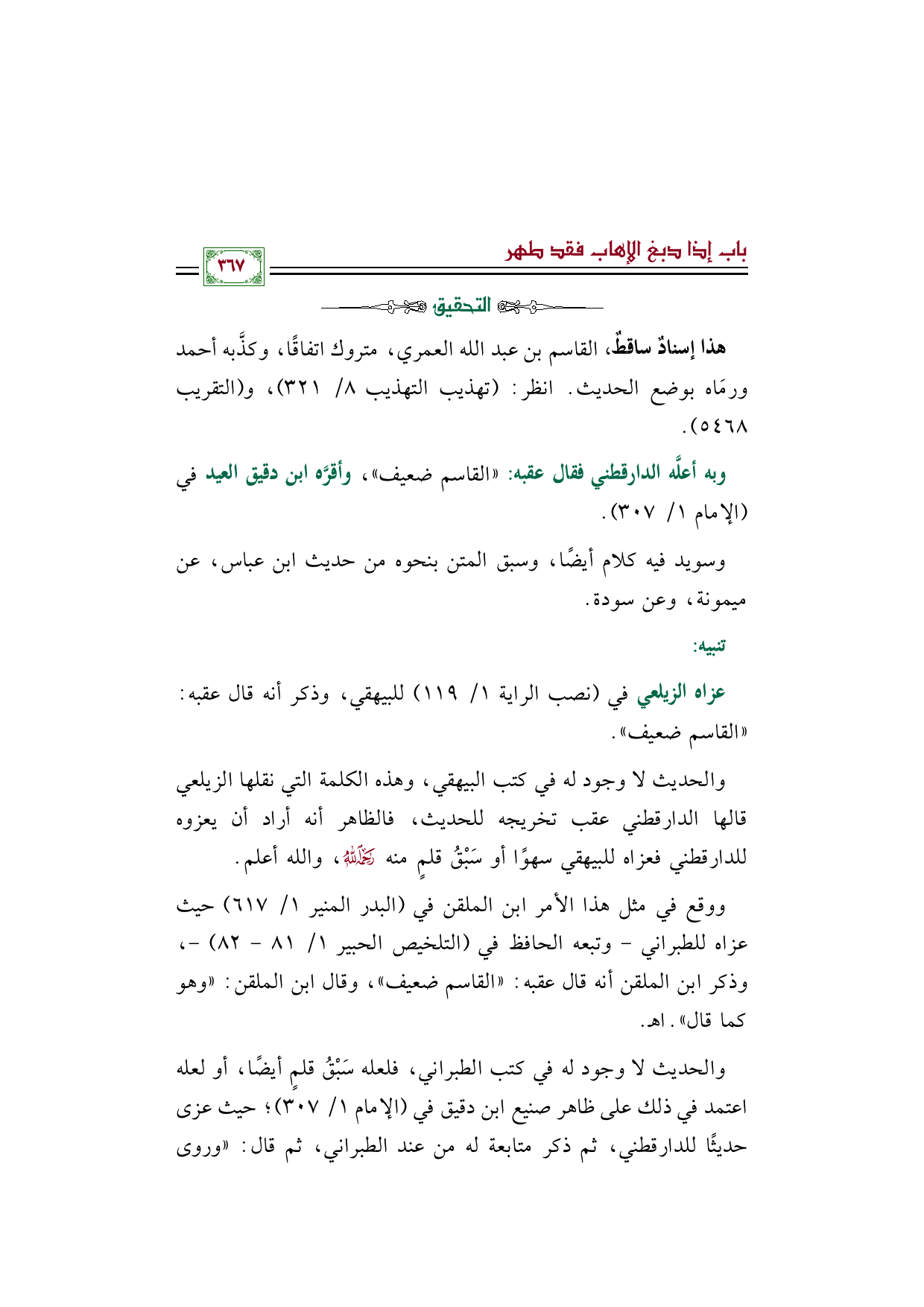 ووقع في مثل هذا الأمر ابن الملقن في (البدر المنير ١/ ٦١٧) حيث عزاه للطبراني - وتبعه الحافظ في (التلخيص الحبير ١/ ٨١ - ٨٢) -، وذكر ابن الملقن أنه قال عقبه: ((القاسم ضعيف))، وقال ابن الملقن: ((وهو كما قال)) اهـ.