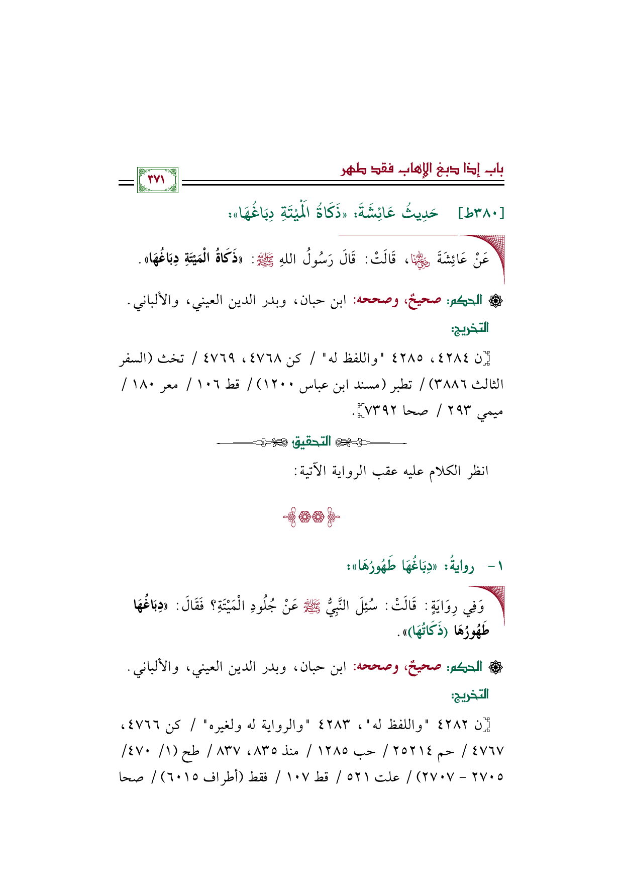 ٣٨٠ - حَدِيثُ عَائِشَةَ: ((ذَكَاةُ الْمَيْتَةِ دِبَاغُهَا)):