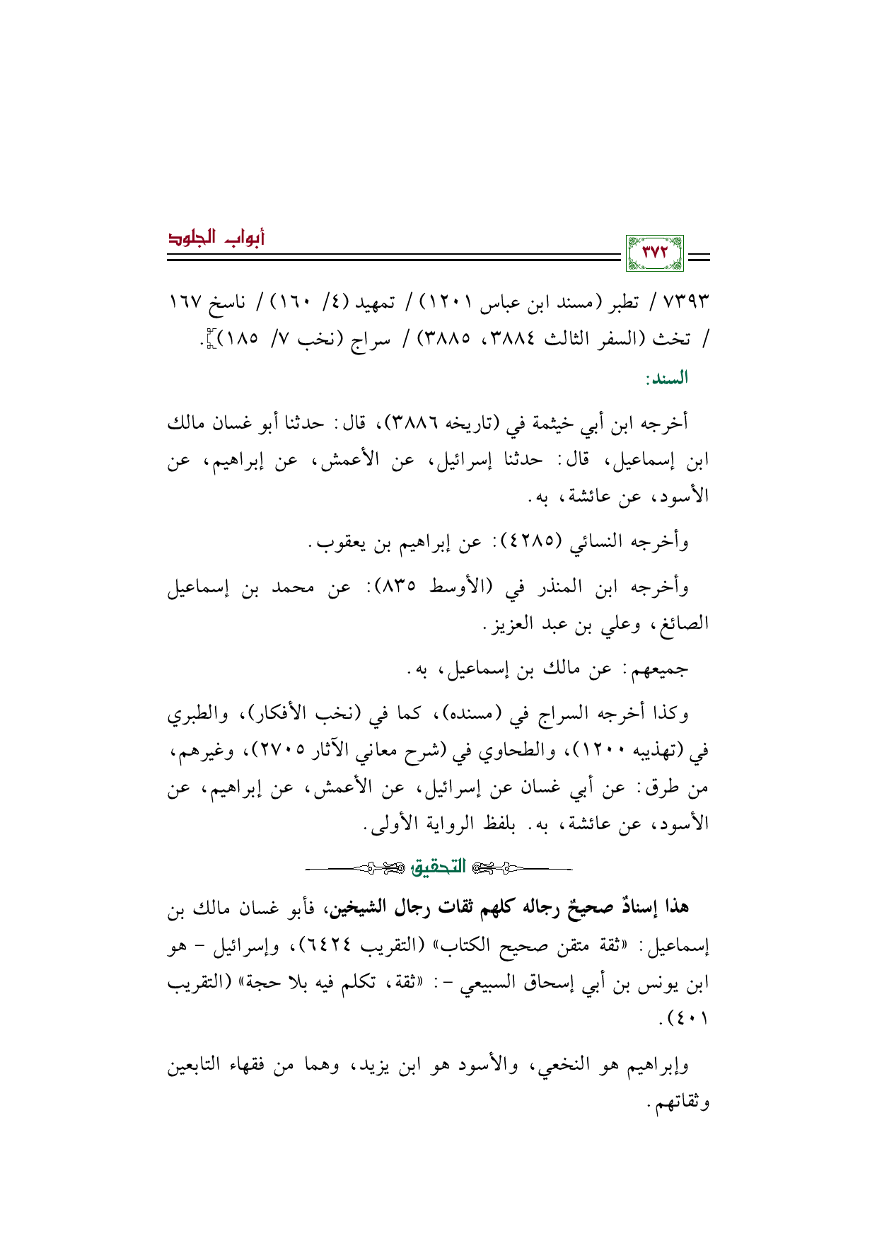 وكذا أخرجه السراج في (مسنده)، كما في (نخب الأفكار)، والطبري في (تهذيبه ١٢٠٠)، والطحاوي في (شرح معاني الآثار ٢٧٠٥)، وغيرهم، من طرق: عن أبي غسان عن إسرائيل، عن الأعمش، عن إبراهيم، عن الأسود، عن عائشة، به. بلفظ الرواية الأولى.