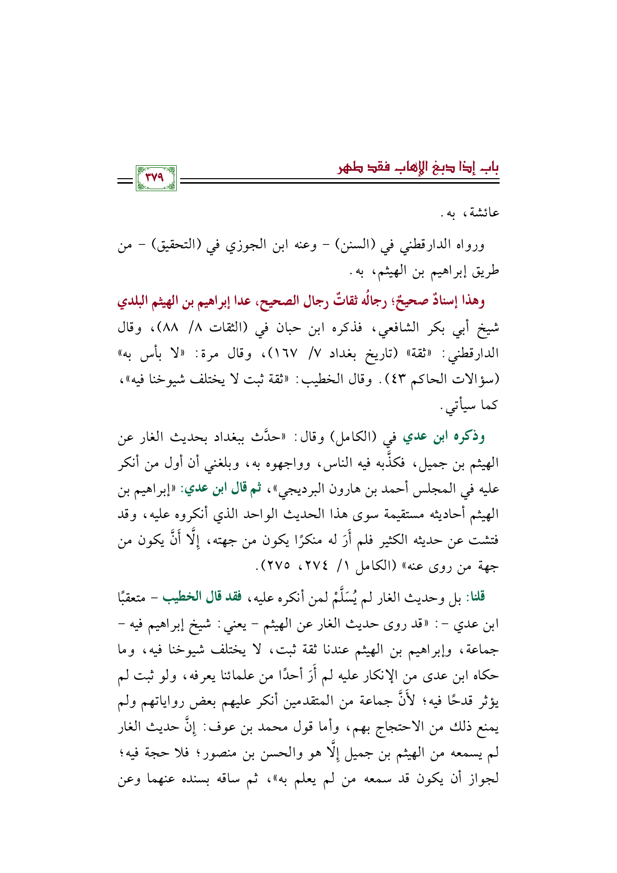 وذكره ابن عدي في (الكامل) وقال: ((حدَّث ببغداد بحديث الغار عن الهيثم بن جميل، فكذَّبه فيه الناس، وواجهوه به، وبلغني أن أول من أنكر عليه في المجلس أحمد بن هارون البرديجي))، ثم قال ابن عدي: ((إبراهيم بن الهيثم أحاديثه مستقيمة سوى هذا الحديث الواحد الذي أنكروه عليه، وقد فتشت عن حديثه الكثير فلم أَرَ له منكرًا يكون من جهته، إِلَّا أَنَّ يكون من جهة من روى عنه)) (الكامل ١/ ٢٧٤، ٢٧٥).