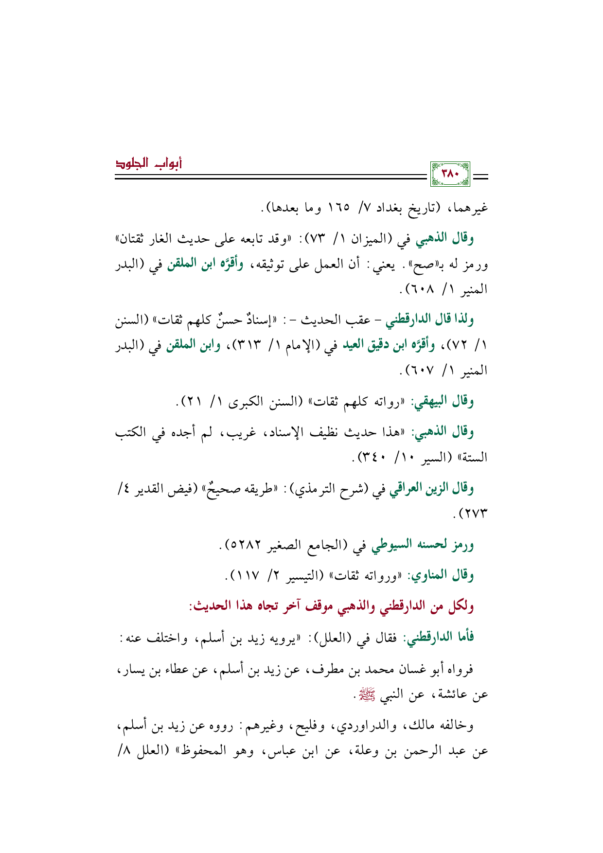 ولذا قال الدارقطني -عقب الحديث-: ((إسنادٌ حسنٌ كلهم ثقات)) (السنن ١/ ٧٢)، وأقرَّه ابن دقيق العيد في (الإمام ١/ ٣١٣)، وابن الملقن في (البدر المنير ١/ ٦٠٧).