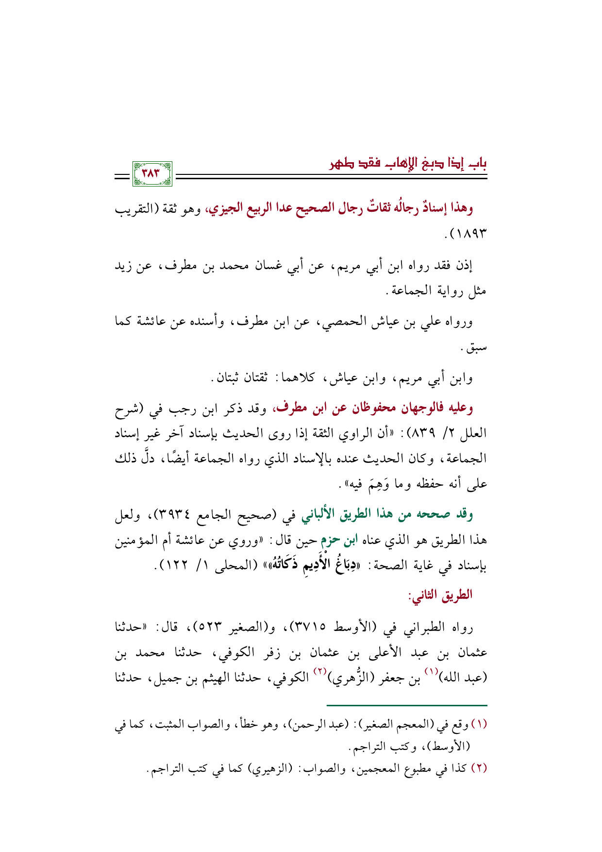 وقد صححه من هذا الطريق الألباني في (صحيح الجامع ٣٩٣٤)، ولعل هذا الطريق هو الذي عناه ابن حزم حين قال: ((وروي عن عائشة أم المؤمنين بإسناد في غاية الصحة: ((دِبَاغُ الْأَدِيمِ ذَكَاتُهُ)))) (المحلى ١/ ١٢٢).