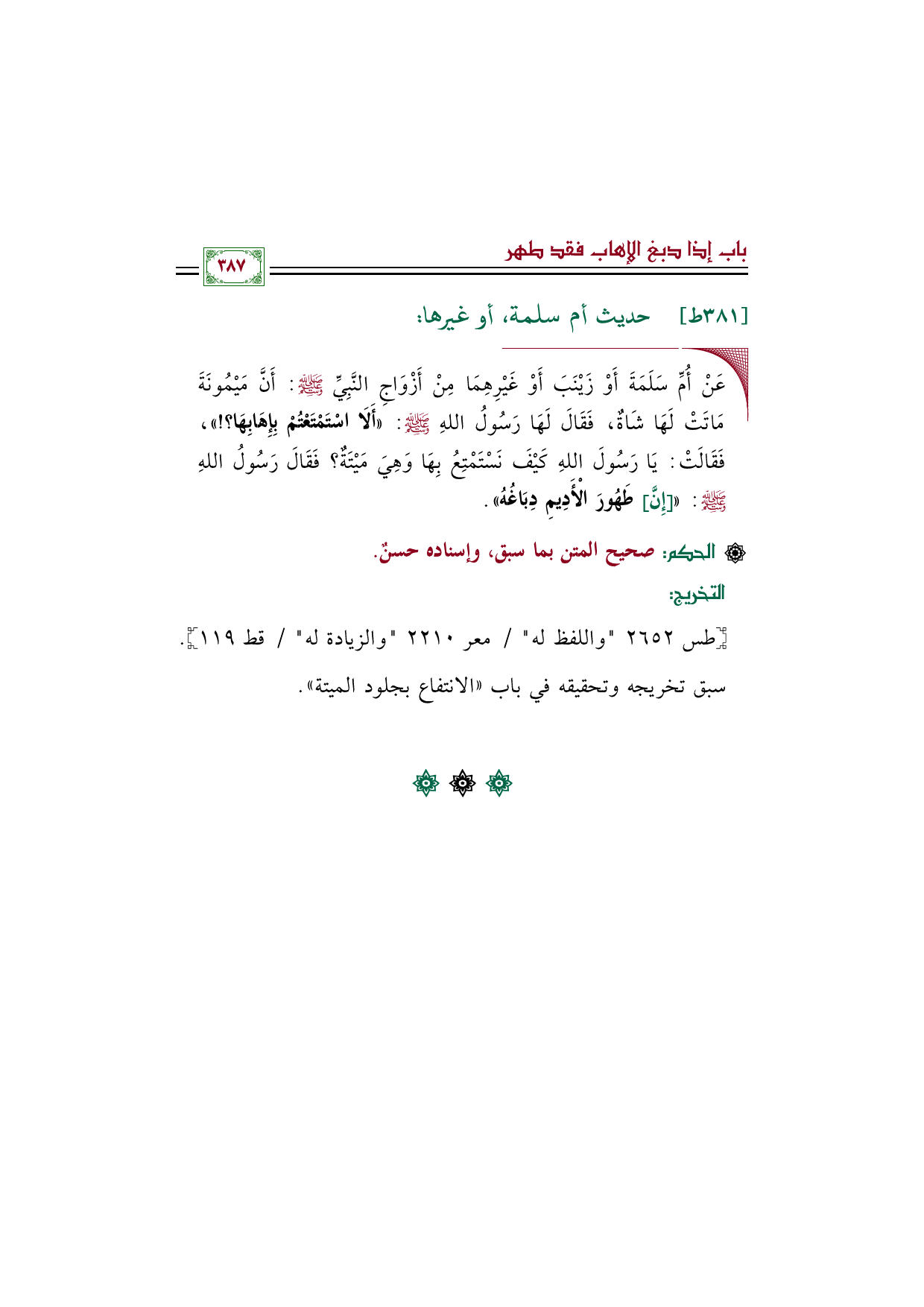 • عَنْ أُمِّ سَلَمَةَ أَوْ زَيْنَبَ أَوْ غَيْرِهِمَا مِنْ أَزْوَاجِ النَّبِيِّ صلى الله عليه وسلم: أَنَّ مَيْمُونَةَ مَاتَتْ لَهَا شَاةٌ، فَقَالَ لَهَا رَسُولُ اللهِ صلى الله عليه وسلم: ((أَلَا اسْتَمْتَعْتُمْ بِإِهَابِهَا؟!))، فَقَالَتْ: يَا رَسُولَ اللهِ كَيْفَ نَسْتَمْتِعُ بِهَا وَهِيَ مَيْتَةٌ؟ فَقَالَ رَسُولُ اللهِ صلى الله عليه وسلم: (([إِنَّ] طَهُورَ الْأَدِيمِ دِبَاغُهُ)).