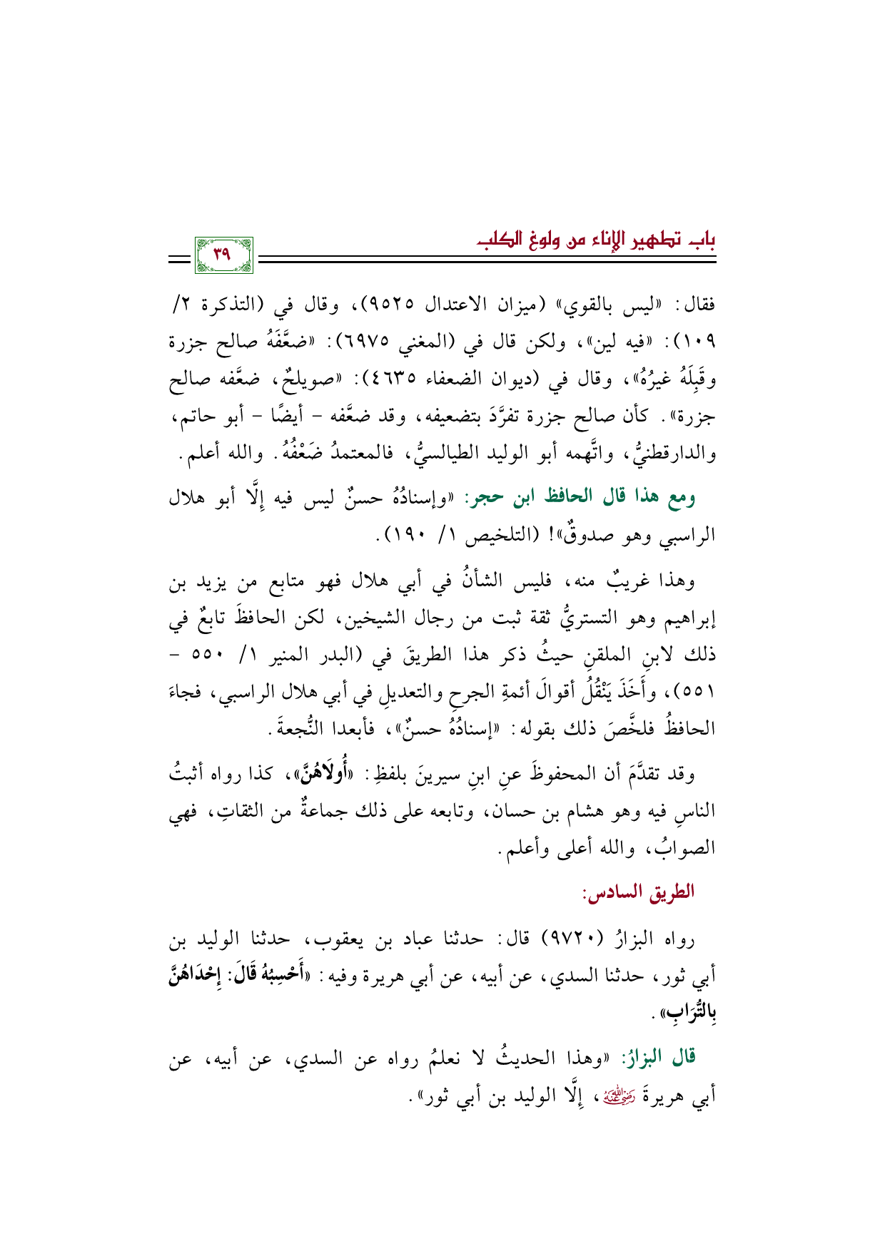 رواه البزارُ (٩٧٢٠) قال: حدثنا عباد بن يعقوب، حدثنا الوليد بن أبي ثور، حدثنا السدي، عن أبيه، عن أبي هريرة وفيه: ((أَحْسِبُهُ قَالَ: إِحْدَاهُنَّ بِالتُّرَابِ)).