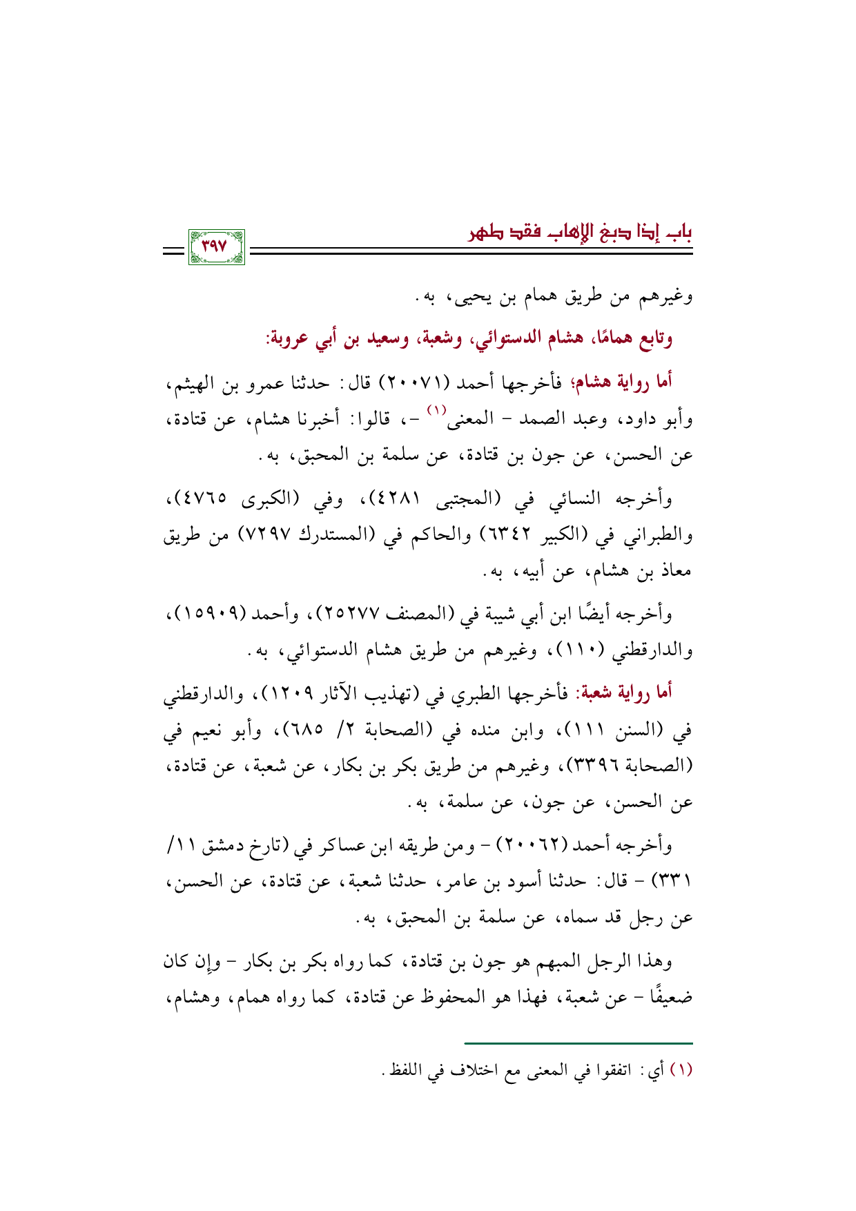 أما رواية هشام؛ فأخرجها أحمد (٢٠٠٧١) قال: حدثنا عمرو بن الهيثم، وأبو داود، وعبد الصمد -المعنى (¬١) -، قالوا: أخبرنا هشام، عن قتادة، عن الحسن، عن جون بن قتادة، عن سلمة بن المحبق، به.