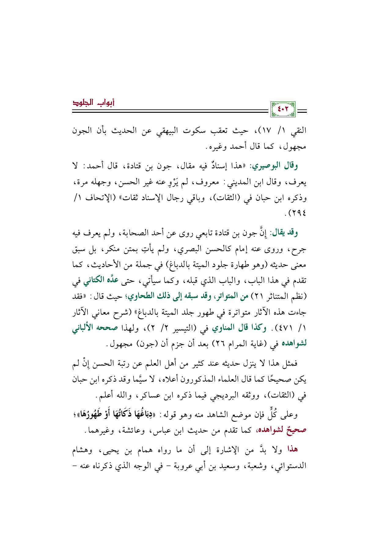وقد يقال: إِنَّ جون بن قتادة تابعي روى عن أحد الصحابة، ولم يعرف فيه جرح، وروى عنه إمام كالحسن البصري، ولم يأتِ بمتن منكر، بل سبق معنى حديثه (وهو طهارة جلود الميتة بالدباغ) في جملة من الأحاديث، كما تقدم في هذا الباب، والباب الذي قبله، وكما سيأتي، حتى عدَّه الكتاني في (نظم المتناثر ٢١) من المتواتر، وقد سبقه إلى ذلك الطحاوي؛ حيث قال: ((فقد جاءت هذه الآثار متواترة في طهور جلد الميتة بالدباغ)) (شرح معاني الآثار ١/ ٤٧١). وكذا قال المناوي في (التيسير ٢/ ٢)، ولهذا صححه الألباني لشواهده في (غاية المرام ٢٦) بعد أن جزم أن (جون) مجهول.