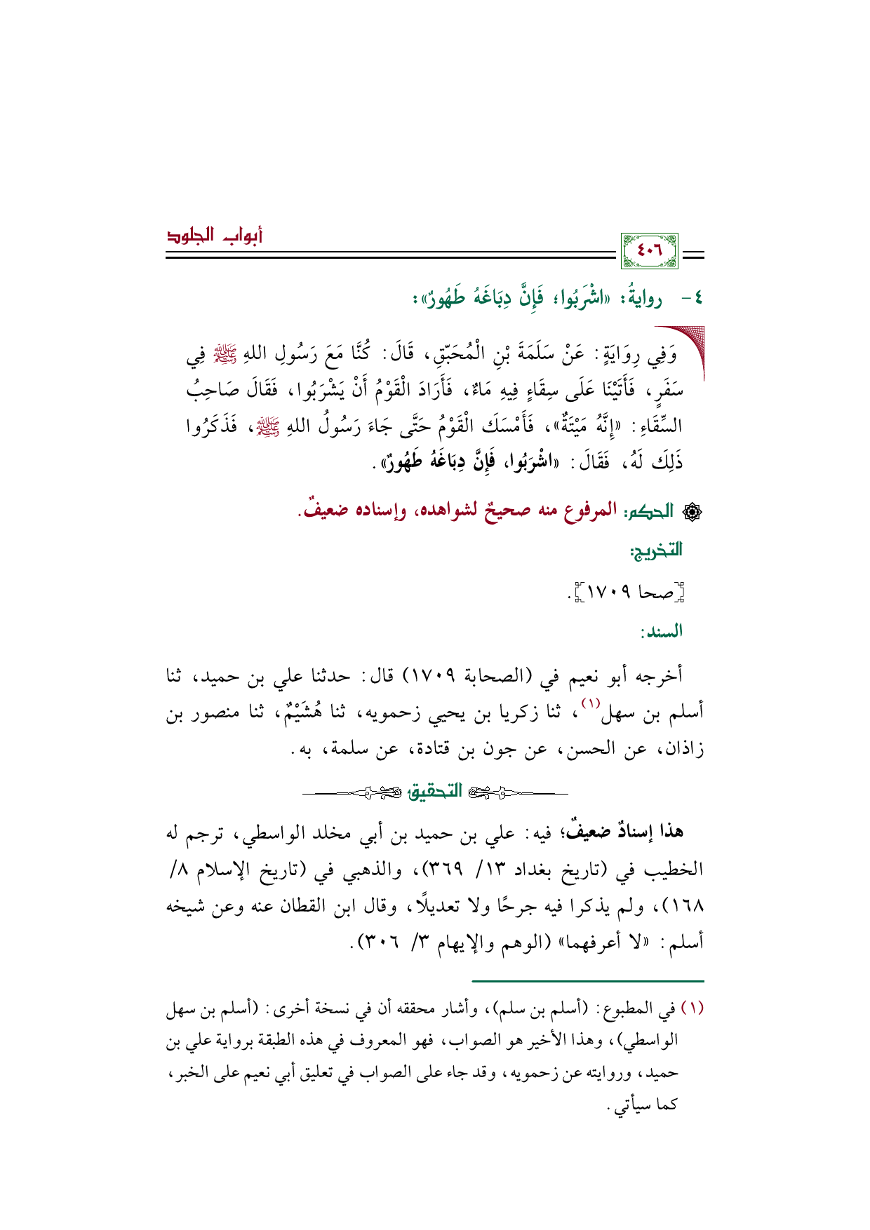 • وَفِي رِوَايَةٍ: عَنْ سَلَمَةَ بْنِ الْمُحَبّقِ، قَالَ: كُنَّا مَعَ رَسُولِ اللهِ صلى الله عليه وسلم فِي سَفَرٍ، فَأَتَيْنَا عَلَى سِقَاءٍ فِيهِ مَاءٌ، فَأَرَادَ الْقَوْمُ أَنْ يَشْرَبُوا، فَقَالَ صَاحِبُ السِّقَاءِ: ((إِنَّهُ مَيْتَةٌ))، فَأَمْسَكَ الْقَوْمُ حَتَّى جَاءَ رَسُولُ اللهِ صلى الله عليه وسلم، فَذَكَرُوا ذَلِكَ لَهُ، فَقَالَ: ((اشْرَبُوا، فَإِنَّ دِبَاغَهُ طَهُورٌ))