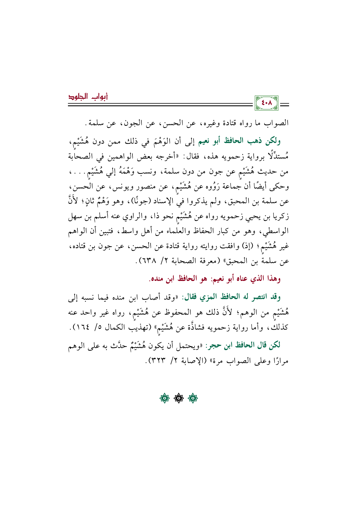 ولكن ذهب الحافظ أبو نعيم إلى أن الوَهْمَ في ذلك ممن دون هُشَيْمٍ، مُستدِّلًا برواية زحمويه هذه، فقال: ((أخرجه بعض الواهمين في الصحابة من حديث هُشَيْمٍ عن جون من دون سلمة، ونسب وَهْمَهُ إلي هُشَيْمٍ ... ، وحكى أيضًا أن جماعة رَوُوه عن هُشَيْمٍ، عن منصور ويونس، عن الحسن، عن سلمة بن المحبق، ولم يذكروا في الإسناد (جونًا)، وهو وَهْمٌ ثانٍ؛ لأَنَّ زكريا بن يحيي زحمويه رواه عن هُشَيْمٍ نحو ذا، والراوي عنه أسلم بن سهل الواسطي، وهو من كبار الحفاظ والعلماء من أهل واسط، فتبين أن الواهم غير هُشَيْمٍ؛ (إذ) وافقت روايته رواية قتادة عن الحسن، عن جون بن قتاده، عن سلمة بن المحبق)) (معرفة الصحابة ٢/ ٦٣٨).