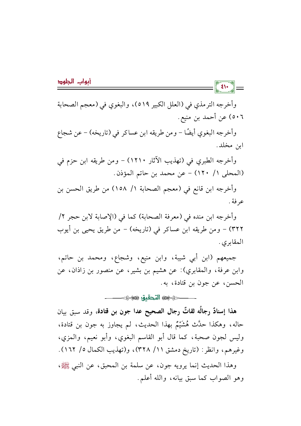 وأخرجه الترمذي في (العلل الكبير ٥١٩)، والبغوي في (معجم الصحابة ٥٠٦) عن أحمد بن منيع.