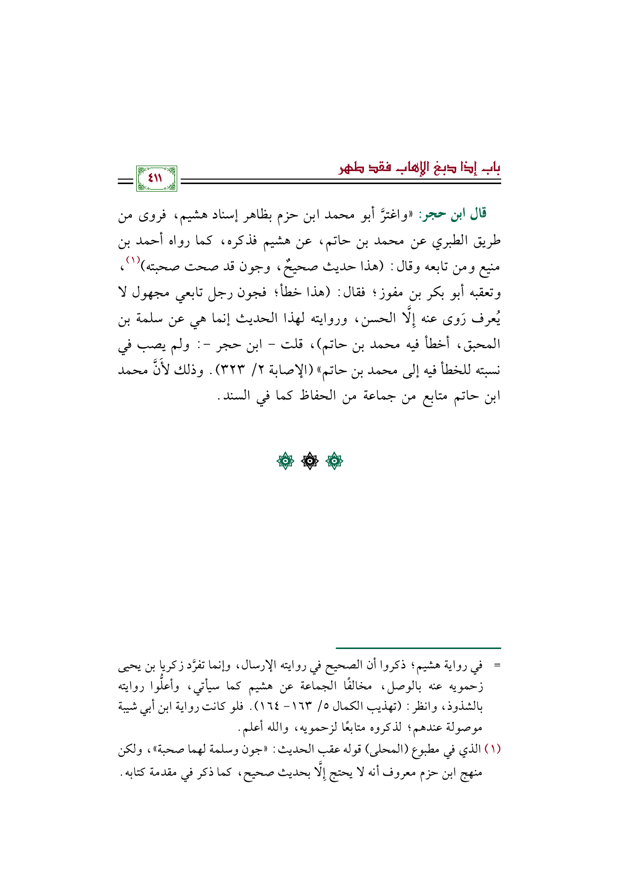 قال ابن حجر: ((واغترَّ أبو محمد ابن حزم بظاهر إسناد هشيم، فروى من طريق الطبري عن محمد بن حاتم، عن هشيم فذكره، كما رواه أحمد بن منيع ومن تابعه وقال: (هذا حديث صحيحٌ، وجون قد صحت صحبته) (¬١)، وتعقبه أبو بكر بن مفوز؛ فقال: (هذا خطأ؛ فجون رجل تابعي مجهول لا يُعرف رَوى عنه إِلَّا الحسن، وروايته لهذا الحديث إنما هي عن سلمة بن المحبق، أخطأ فيه محمد بن حاتم)، قلت -ابن حجر-: ولم يصب في نسبته للخطأ فيه إلى محمد بن حاتم)) (الإصابة ٢/ ٣٢٣). وذلك لأَنَّ محمد بن حاتم متابع من جماعة من الحفاظ كما في السند.