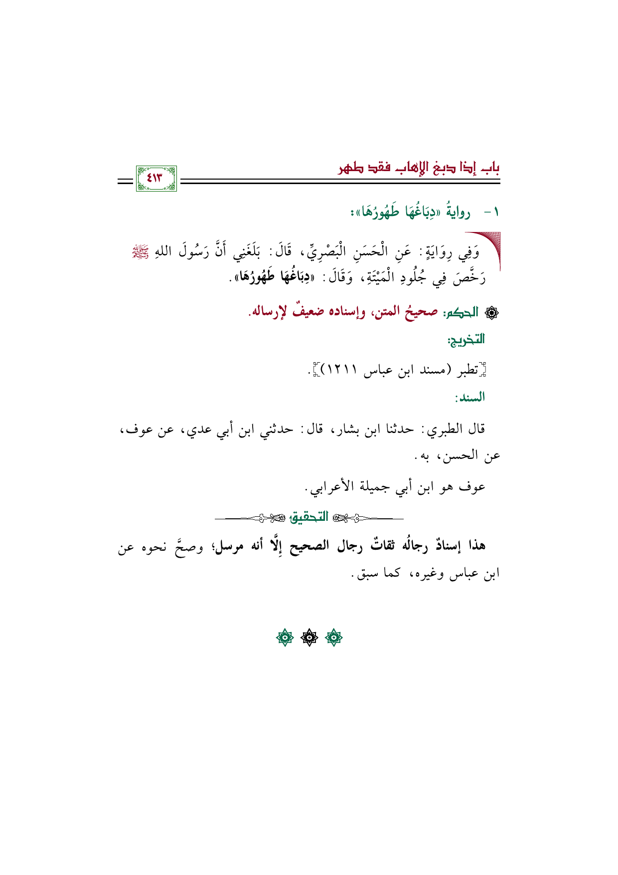 • وَفِي رِوَايَةٍ: عَنِ الْحَسَنِ الْبَصْرِيِّ، قَالَ: بَلَغَنِي أَنَّ رَسُولَ اللهِ صلى الله عليه وسلم رَخَّصَ فِي جُلُودِ الْمَيْتَةِ، وَقَالَ: ((دِبَاغُهَا طَهُورُهَا)).