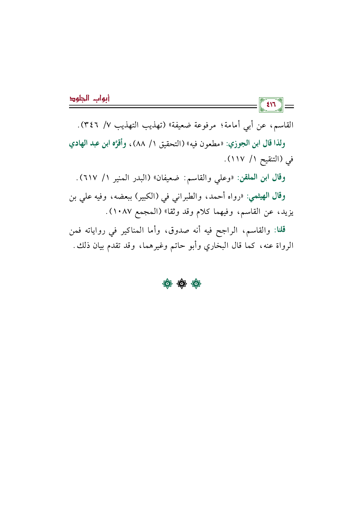 وقال ابن الملقن: ((وعلي والقاسم: ضعيفان)) (البدر المنير ١/ ٦١٧).