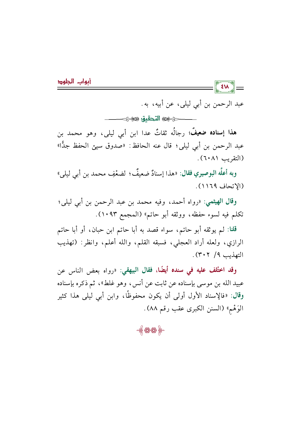 وقال الهيثمي: ((رواه أحمد، وفيه محمد بن عبد الرحمن بن أبي ليلى؛ تكلم فيه لسوء حفظه، ووثقه أبو حاتم)) (المجمع ١٠٩٣).