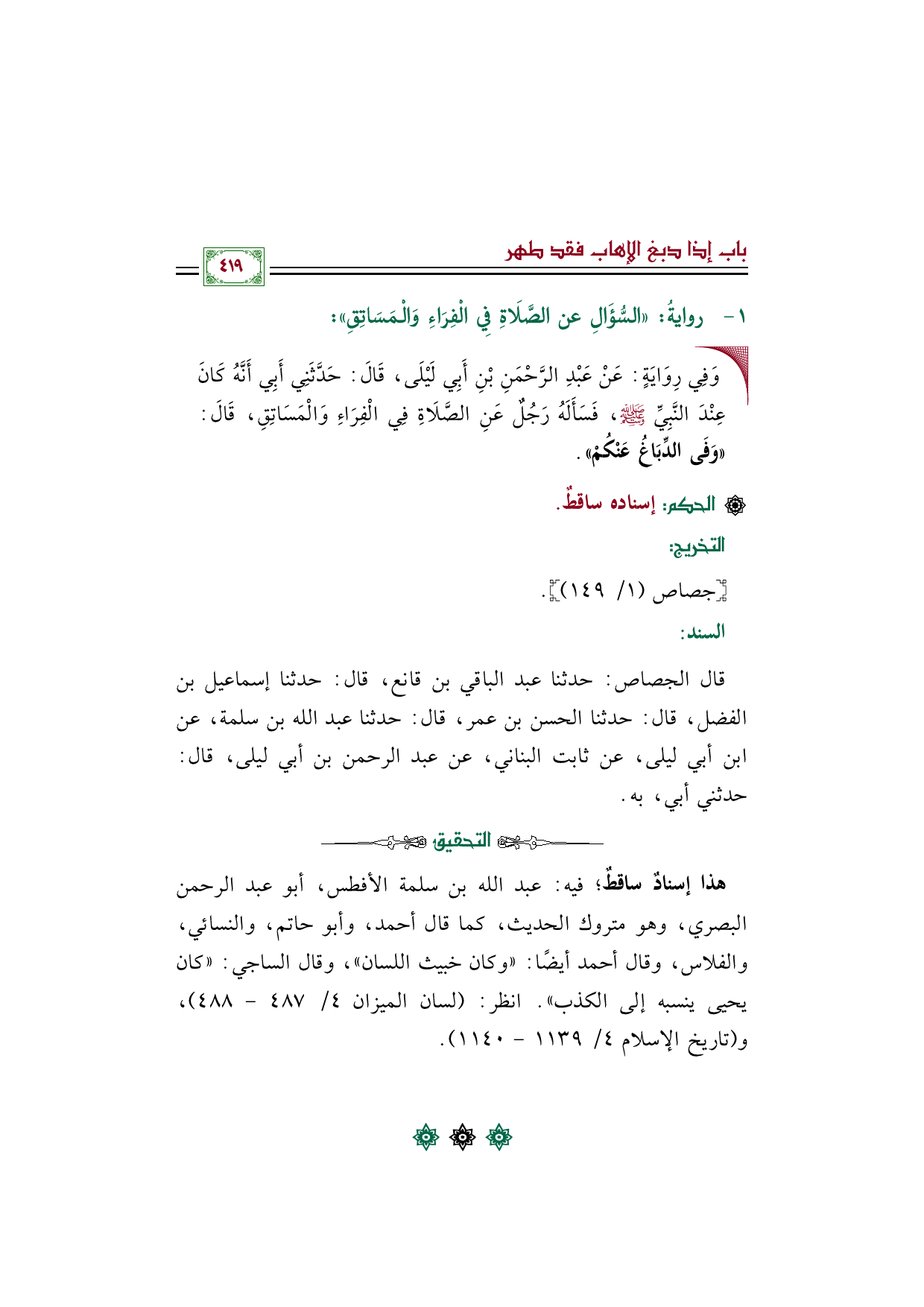 قال الجصاص: حدثنا عبد الباقي بن قانع، قال: حدثنا إسماعيل بن الفضل، قال: حدثنا الحسن بن عمر، قال: حدثنا عبد الله بن سلمة، عن ابن أبي ليلى، عن ثابت البناني، عن عبد الرحمن بن أبي ليلى، قال: حدثني أبي، به.