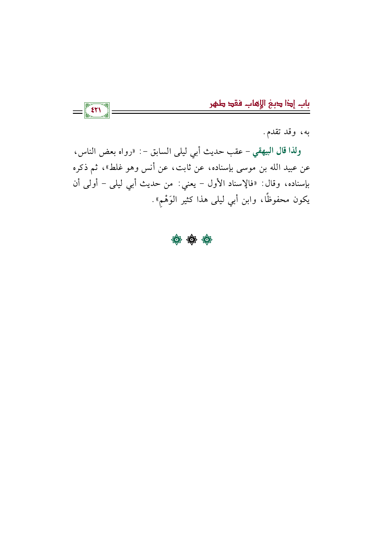 ولذا قال البيهقي -عقب حديث أبي ليلى السابق-: ((رواه بعض الناس، عن عبيد الله بن موسى بإسناده، عن ثابت، عن أنس وهو غلط))، ثم ذكره بإسناده، وقال: ((فالإسناد الأول -يعني: من حديث أبي ليلى- أولى أن يكون محفوظًا، وابن أبي ليلى هذا كثير الوَهْمِ)).